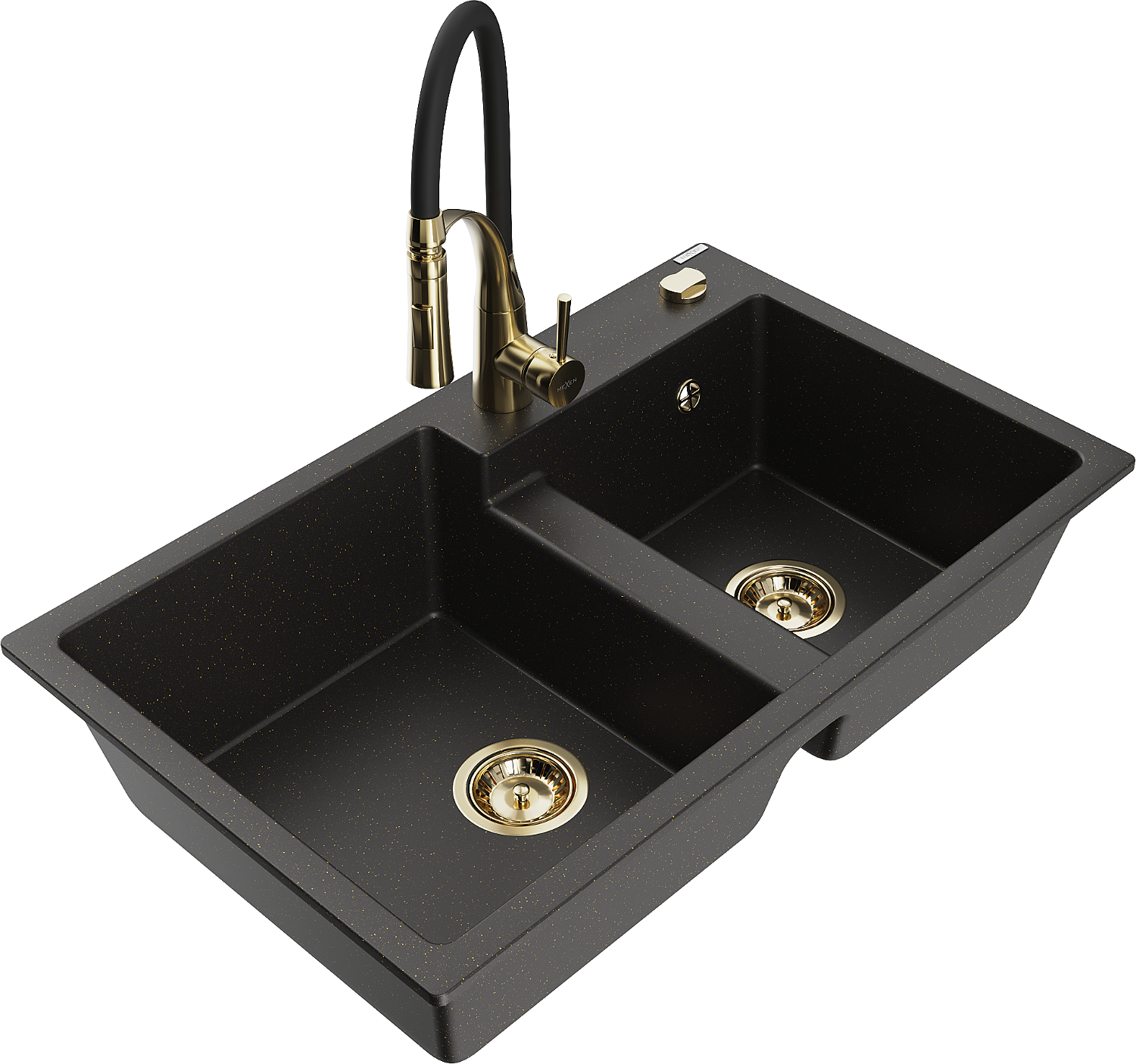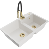 Mexen Tomas granite 2-bowl sink with Aster kitchen tap, black/gold metallic - 6516-75-73450-57-G