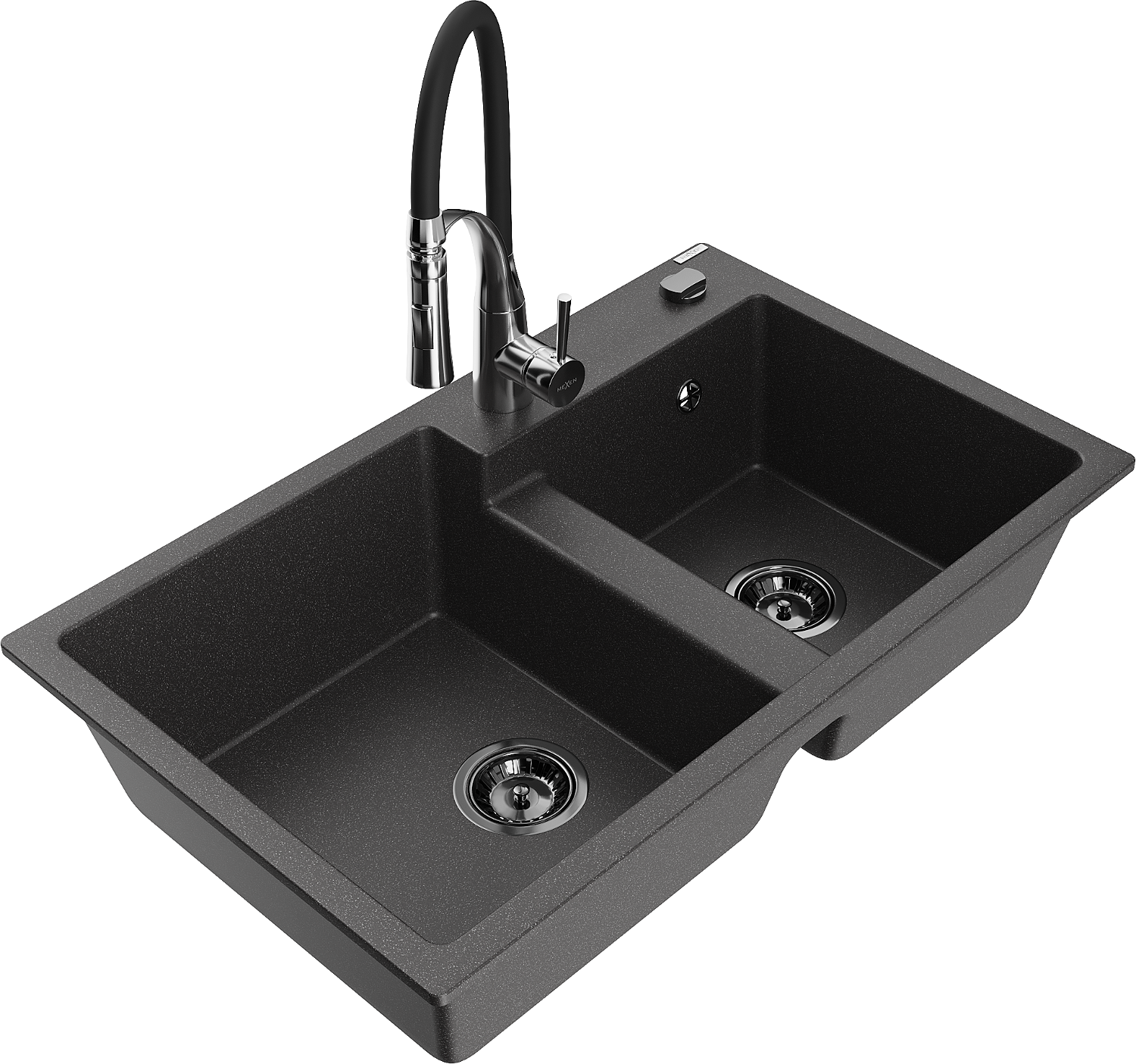 Mexen Tomas granite sink 2-bowl with Aster kitchen tap, black speckled - 6516-76-73450-07-B