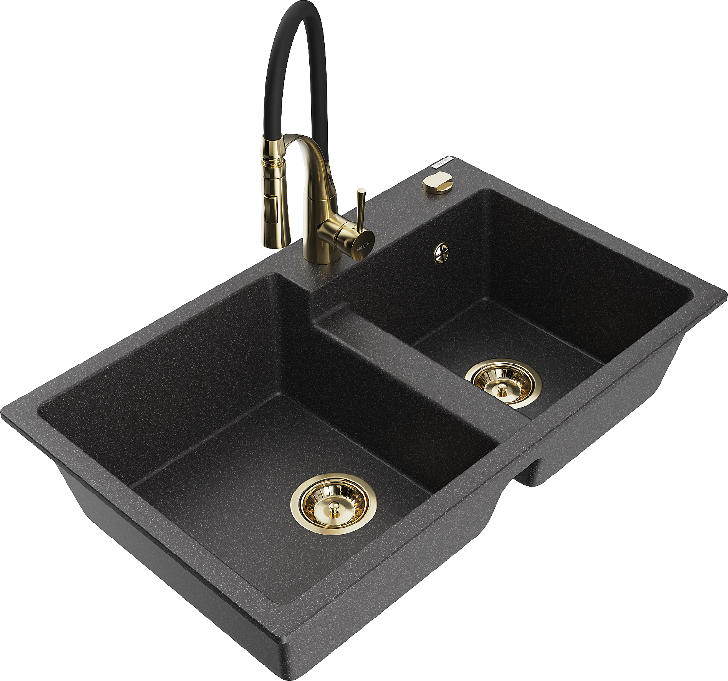 Mexen Tomas granite sink 2-bowl with Aster kitchen tap, black speckled - 6516-76-73450-57-G