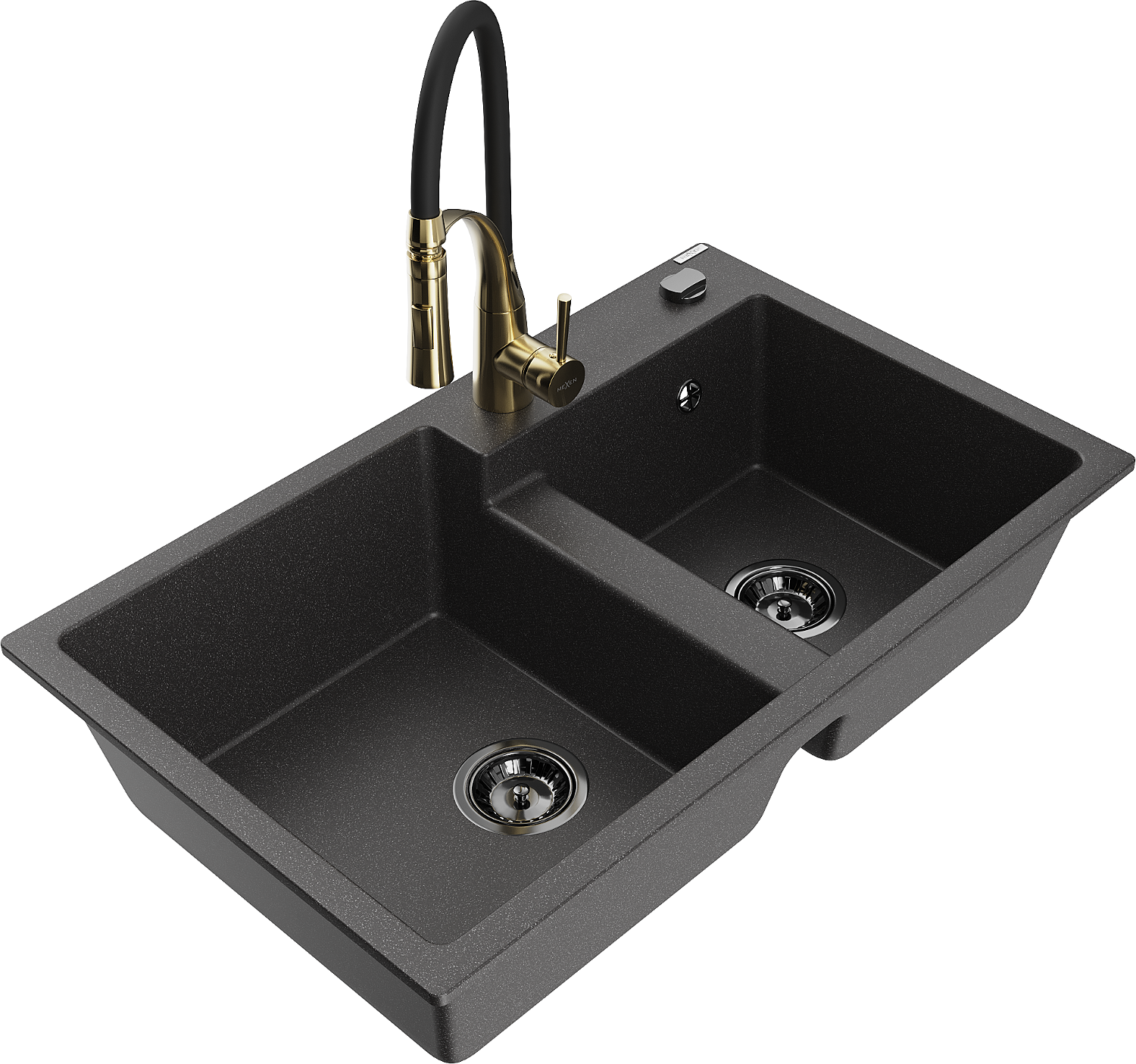 Mexen Tomas granite kitchen sink 2-bowl with Aster tap, black speckled - 6516-76-73450-57-B