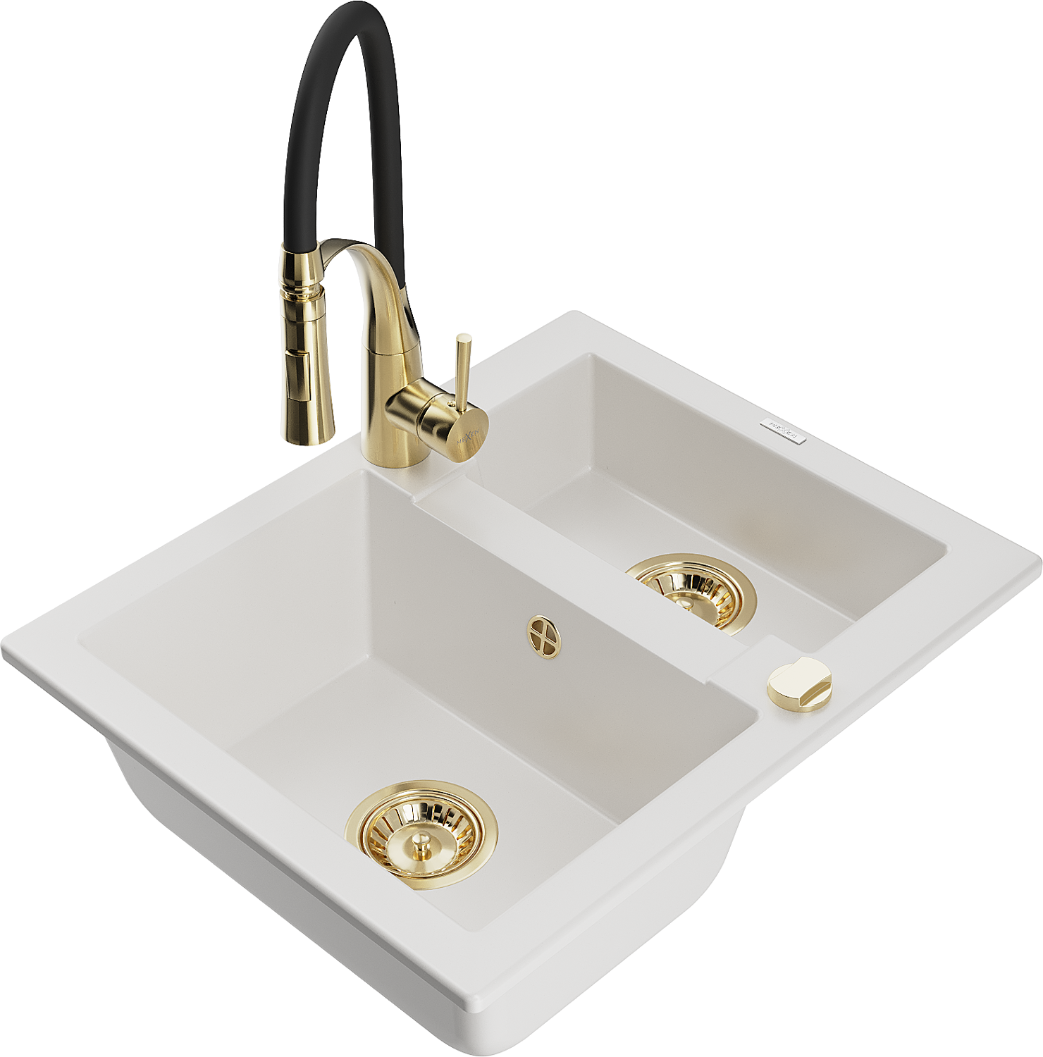 Mexen Carlos granite sink 1.5-bowl with Aster kitchen tap, white - 6518-20-73450-57-G