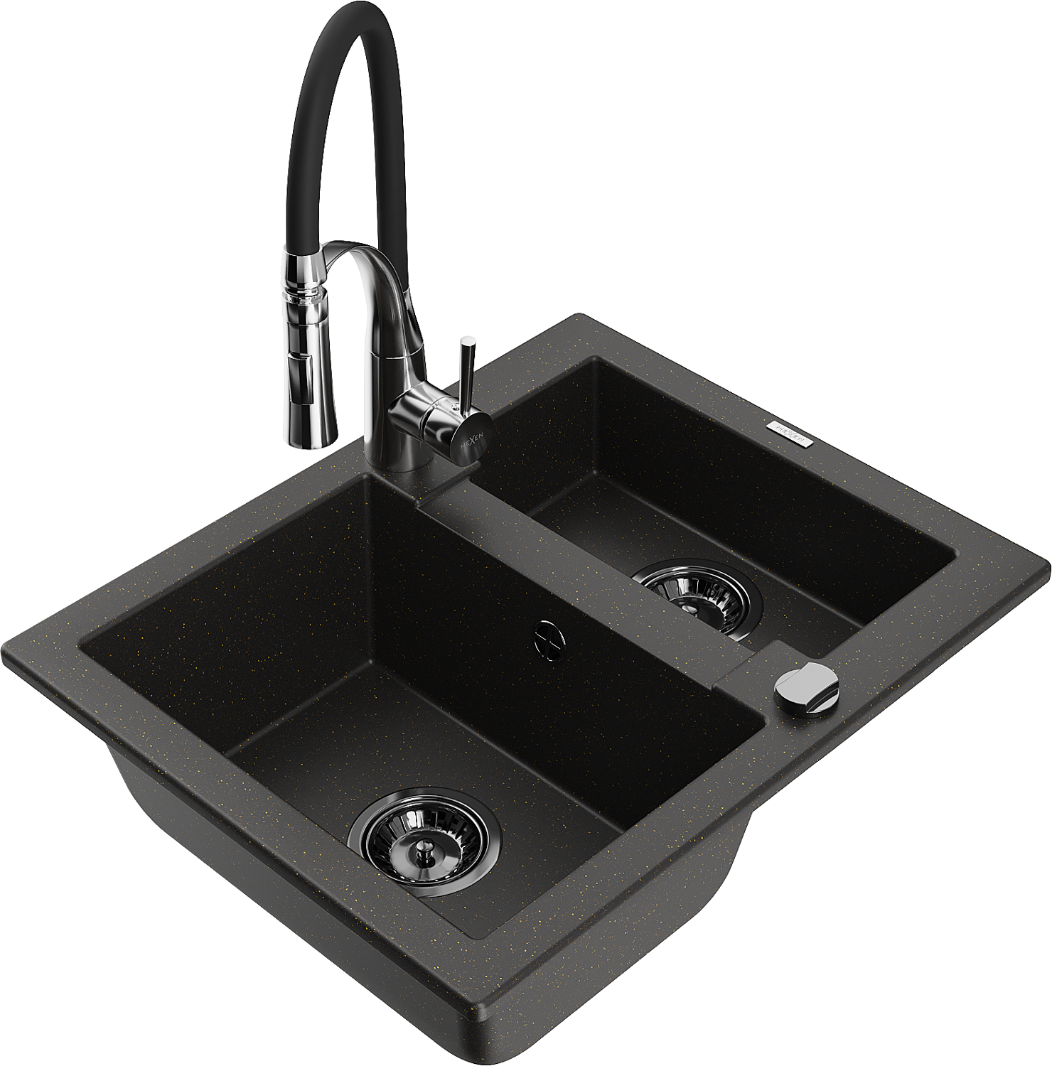 Mexen Carlos 1.5-bowl granite sink with Aster kitchen tap, black/gold metallic - 6518-75-73450-07-B