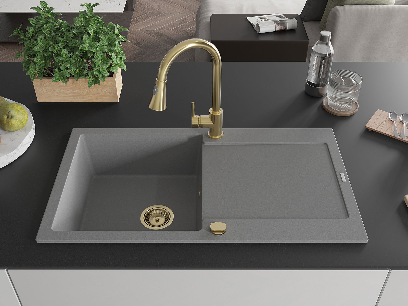 Mexen Leo granite sink 1-bowl with drainer and Elia kitchen tap, grey - 6501-71-670101-50