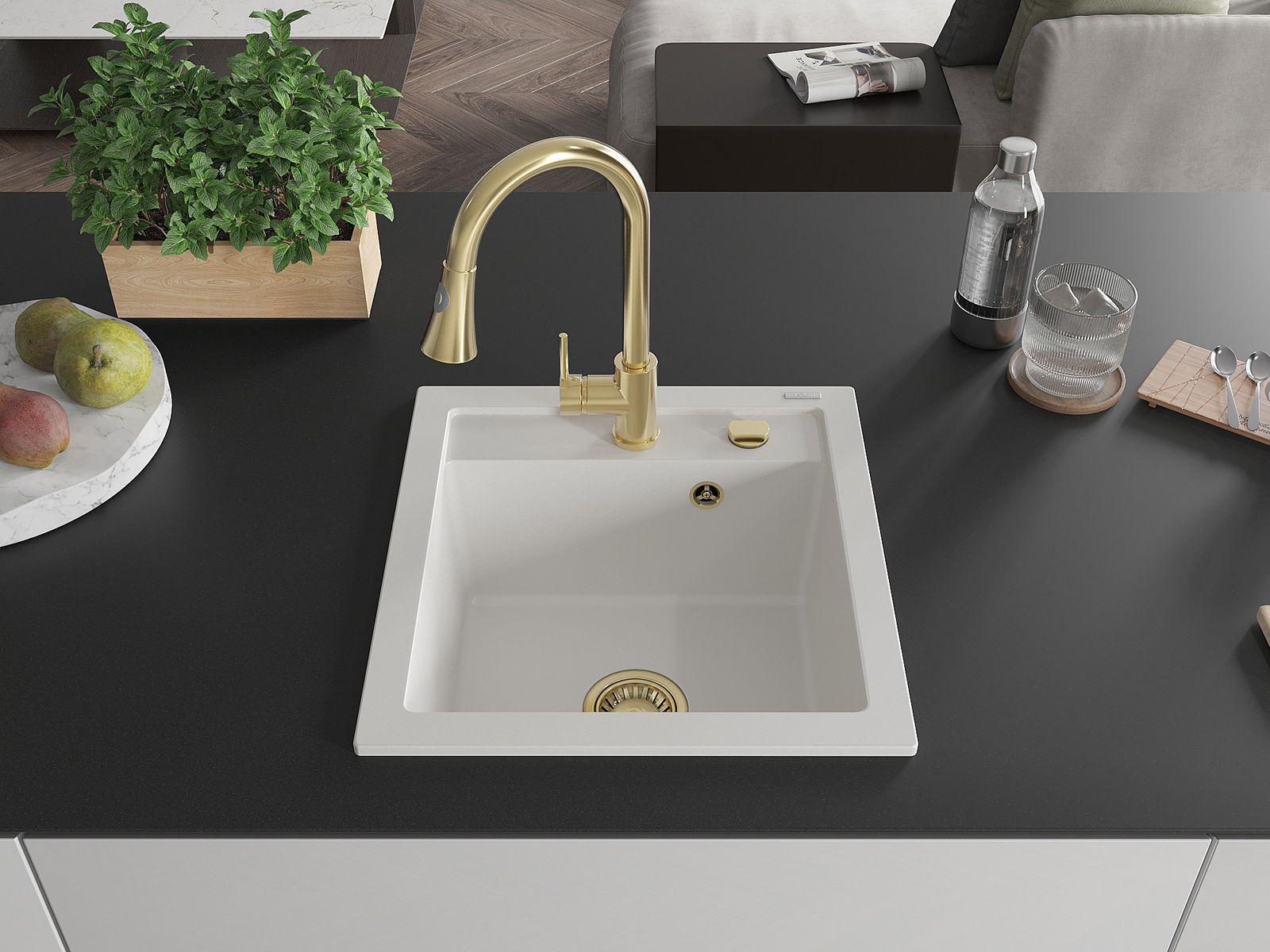 The surface of the sink is resistant to stains and discolouration, making it easy to maintain cleanliness and retain its colour for a long time of use. An aesthetic and practical addition to any kitchen.