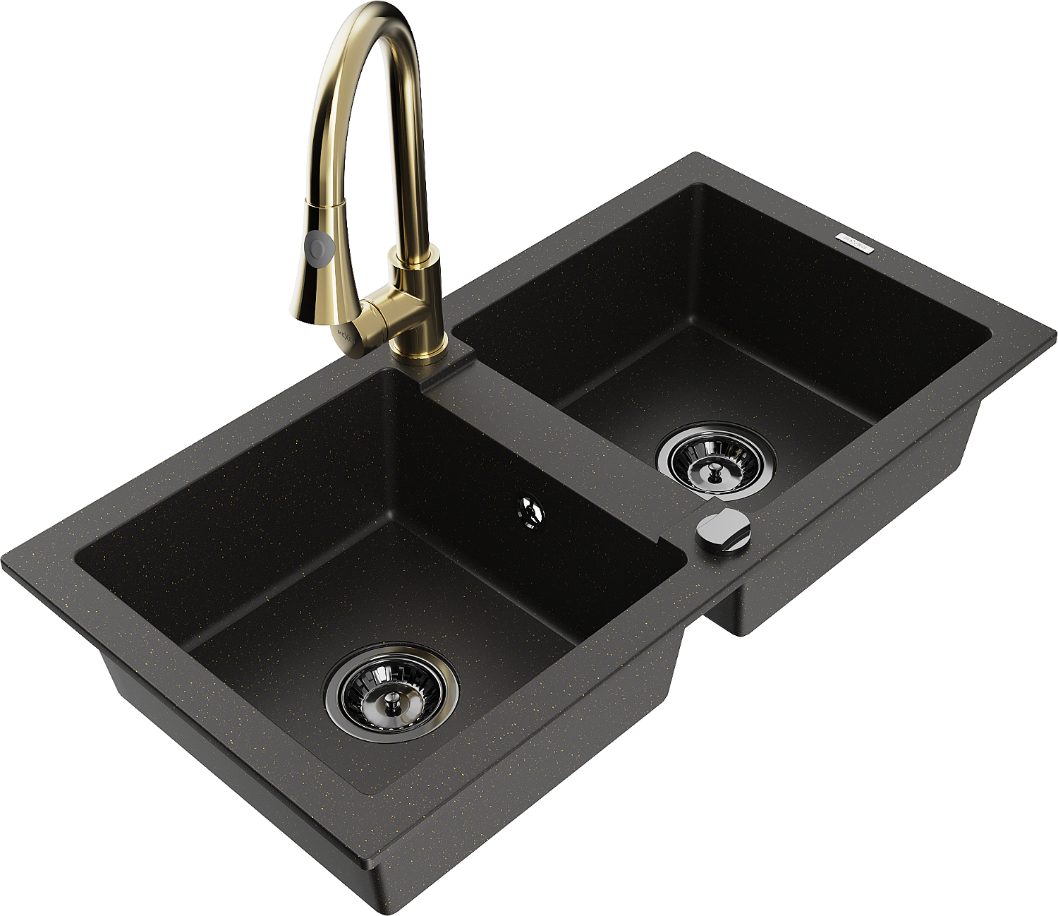 Mexen Mario granite sink 2-bowl with Elia kitchen tap, black/gold metallic - 6504-75-670101-50-B