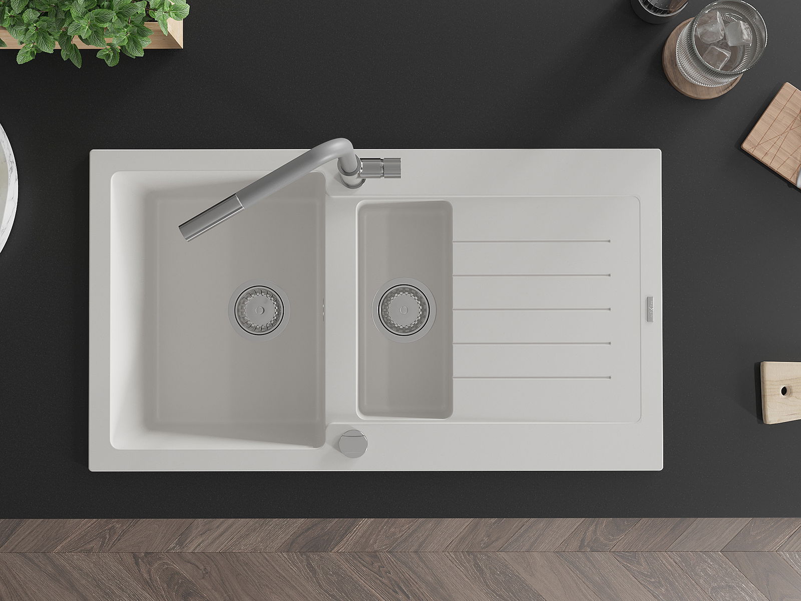 Choosing a sink with a draining board is a practical solution that allows you to set aside washed dishes or vegetables and fruits. The draining board makes daily cooking easier and helps maintain order in the kitchen.