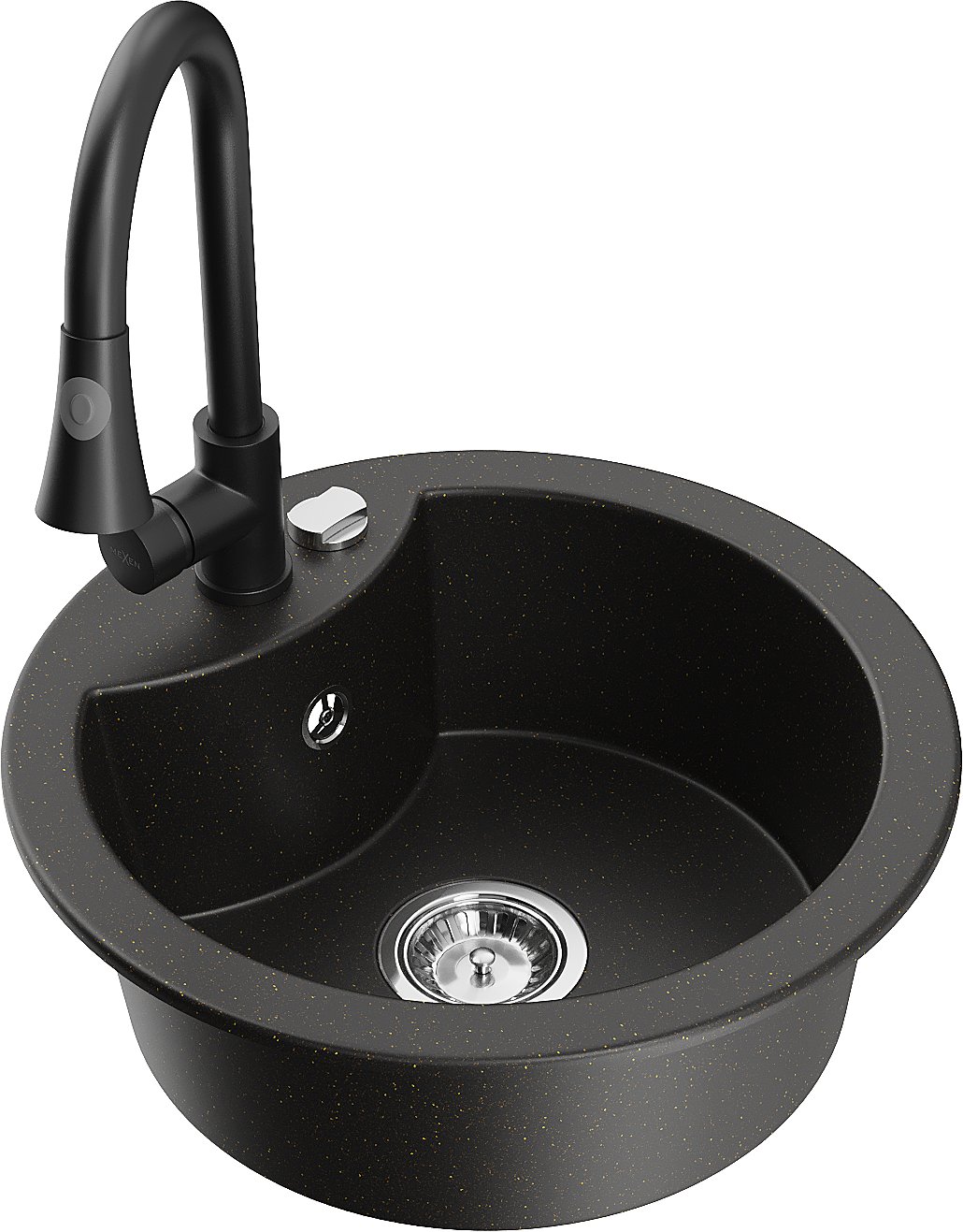 Mexen Diego granite sink 1-bowl with Elia kitchen tap, black/gold metallic - 6512-75-670101-70