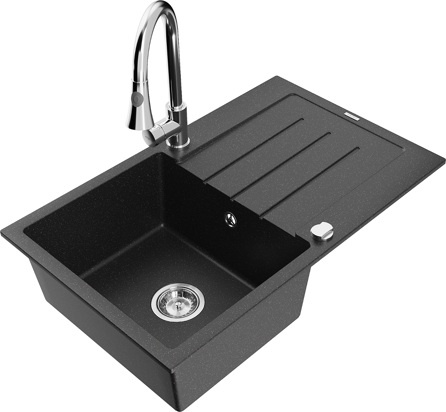 Mexen Bruno Granite Sink 1-Bowl with Drainer and Elia Kitchen Tap, Black/Silver Metallic - 6513-73-670101-00