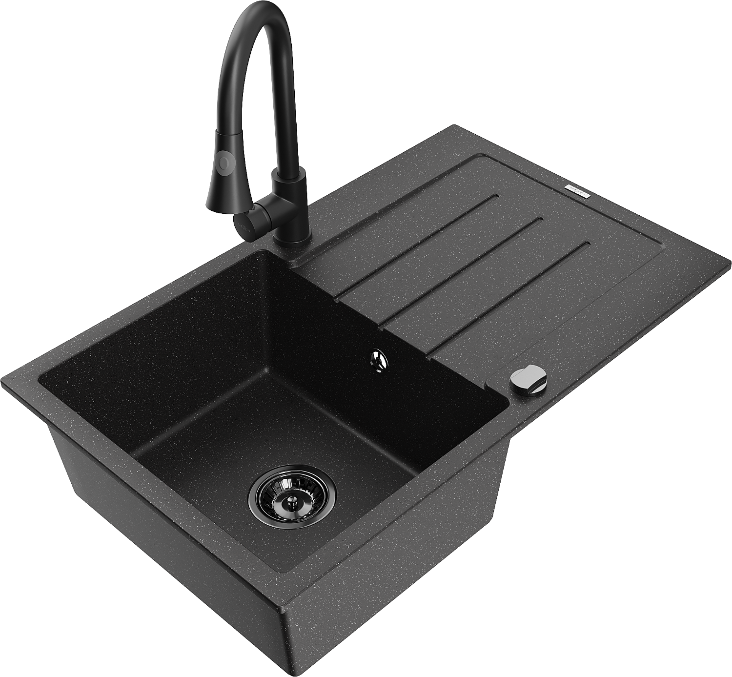 Mexen Bruno 1-bowl granite sink with drainer and Elia kitchen tap, black/silver metallic - 6513-73-670101-70-B