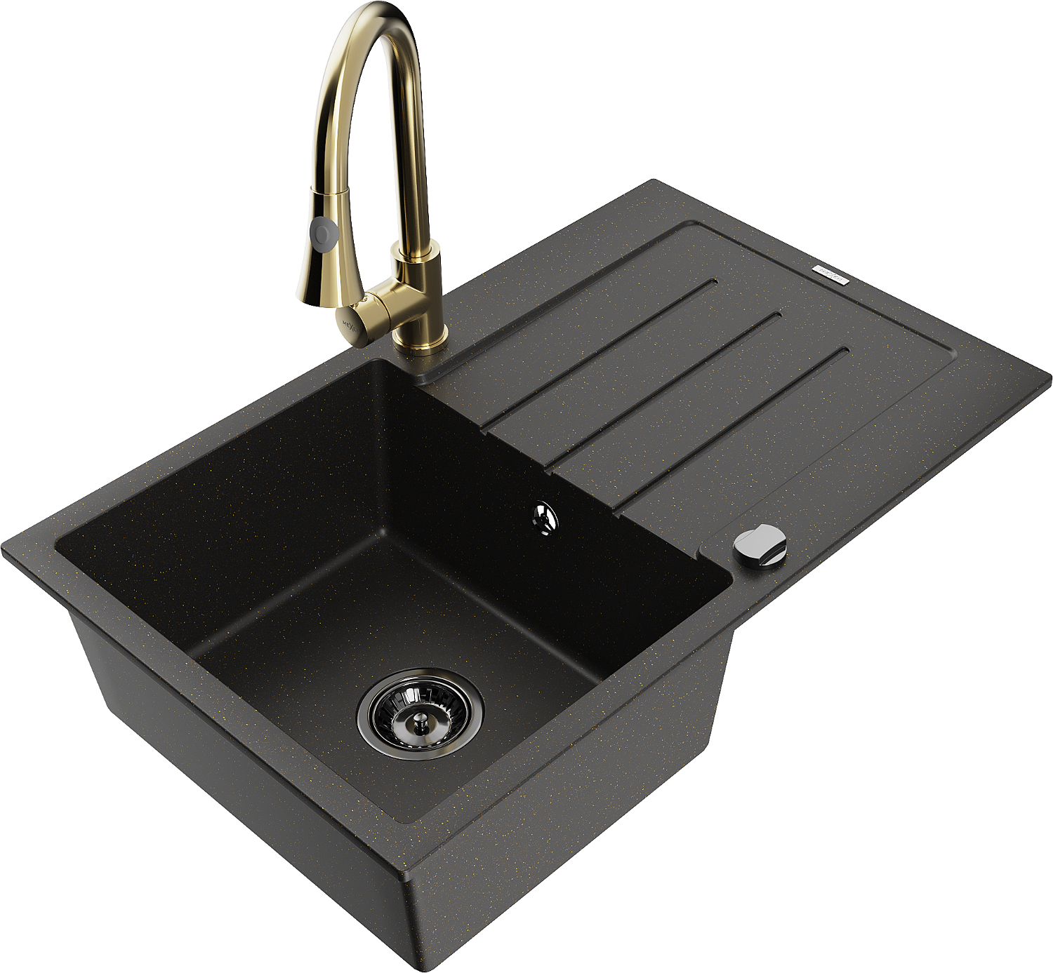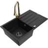 Mexen Bruno granite kitchen sink with drainer and Elia kitchen tap, black/gold metallic - 6513-75-670101-50-B