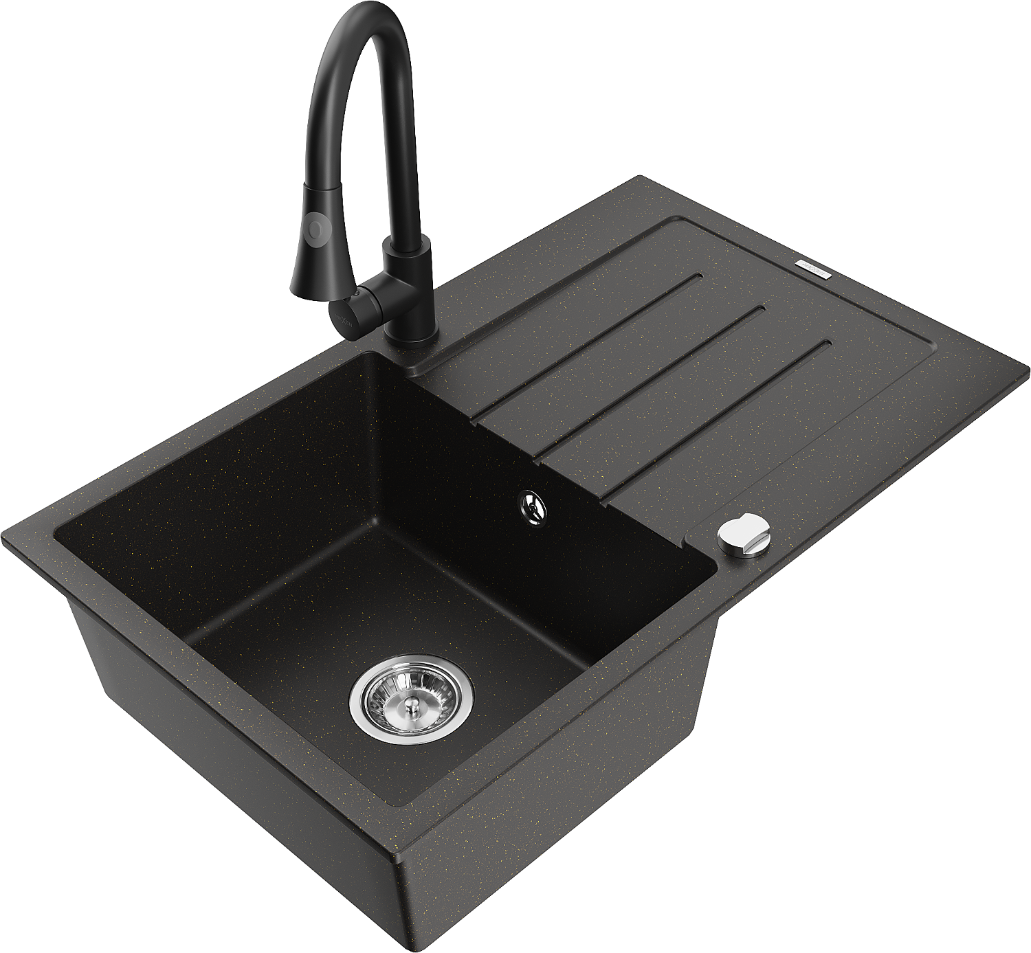 Mexen Bruno single-bowl granite sink with drainer and Elia kitchen tap, black/golden metallic - 6513-75-670101-70