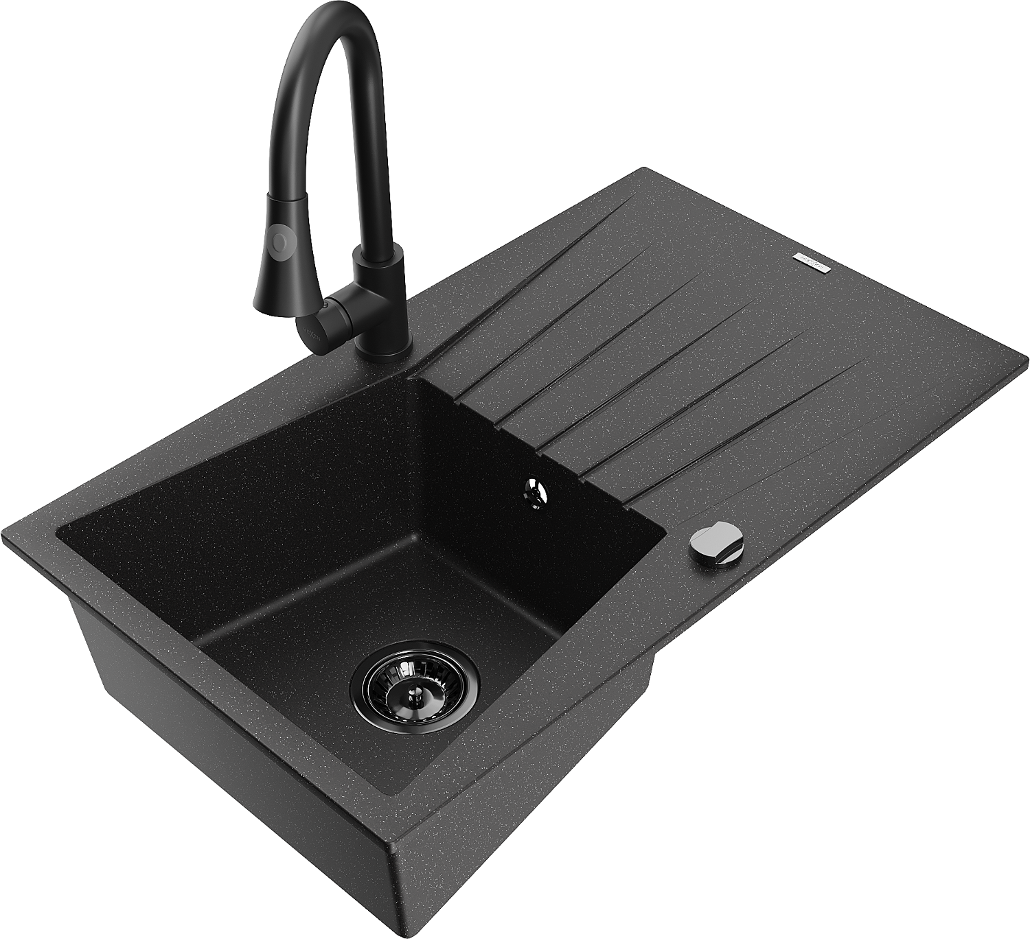Mexen Cesar granite sink 1-bowl with drainer and Elia kitchen tap, black/silver metallic - 6514-73-670101-70-B
