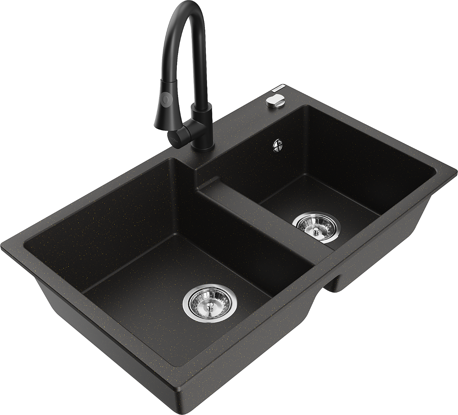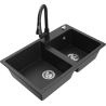 Mexen Tomas 2-bowl granite sink with Elia kitchen tap, black/gold metallic - 6516-75-670101-70