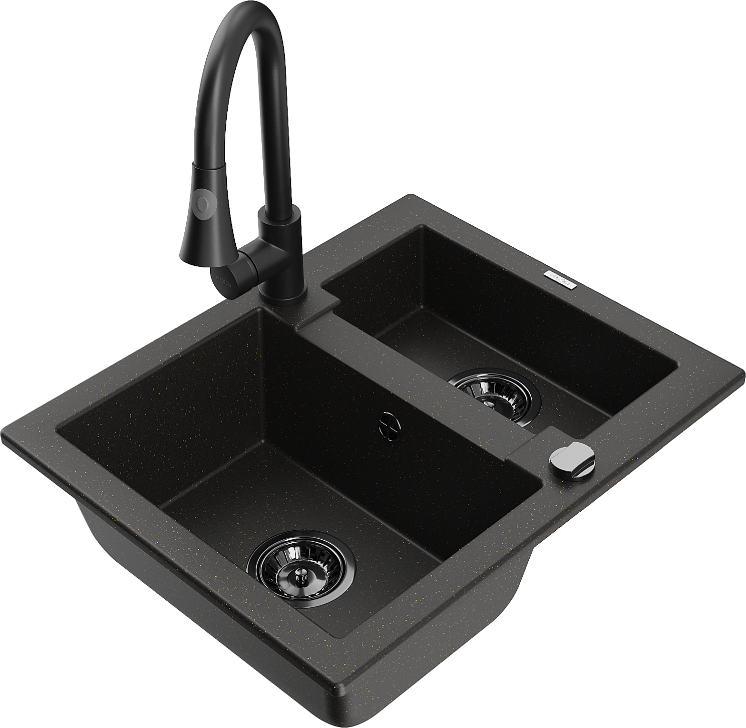 Mexen Carlos granite sink 1.5-bowl with Elia kitchen tap, black/gold metallic - 6518-75-670101-70-B