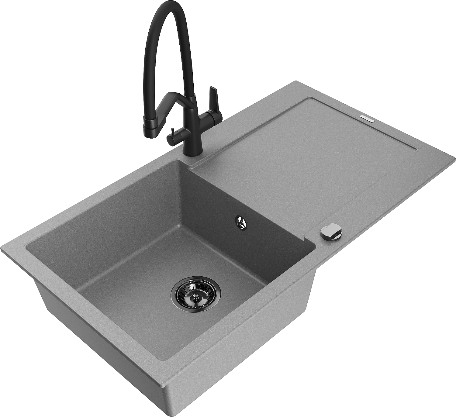 Mexen Leo granite sink 1-bowl with drainer and Duo kitchen tap, grey - 6501-71-671701-70-B