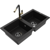 Mexen Mario granite 2-bowl sink with Flora kitchen tap, speckled black - 6504-76-670401-57-B