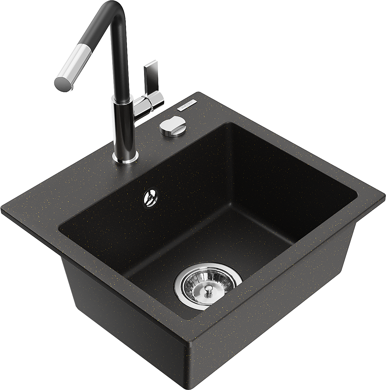 Mexen Milo 1-bowl granite sink with Flora kitchen tap, black/golden metallic - 6505-75-670401-07
