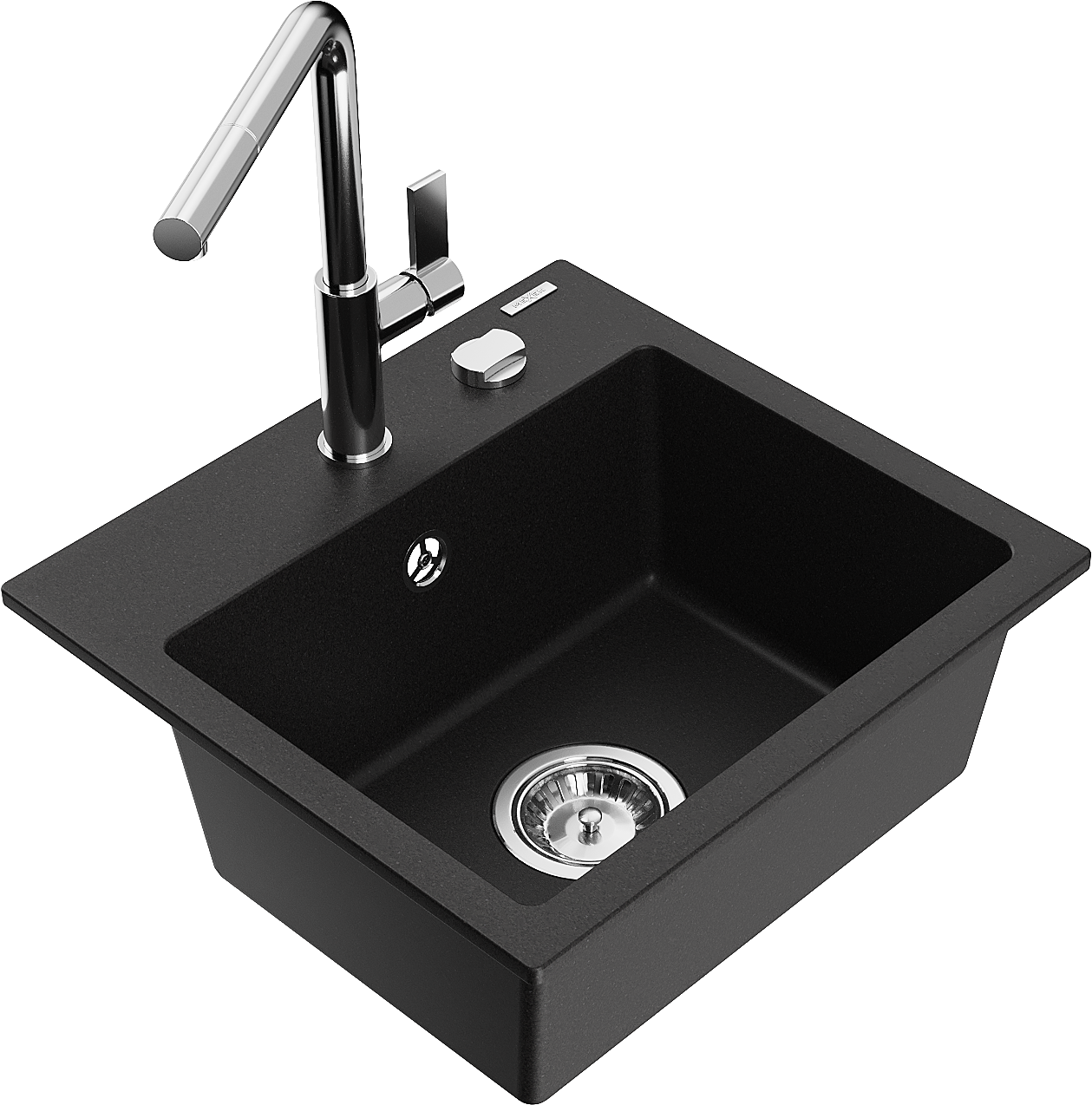 Mexen Milo granite sink 1-bowl with Flora kitchen tap, black - 6505-77-670401-00
