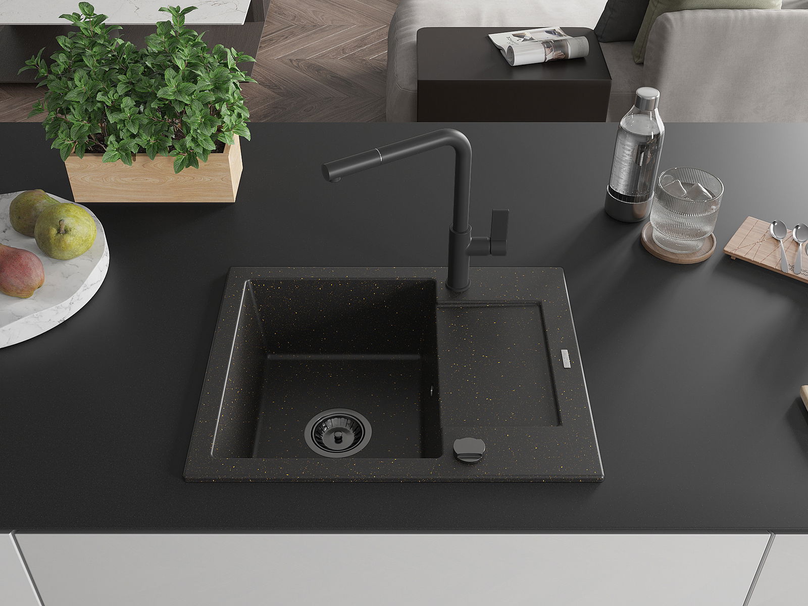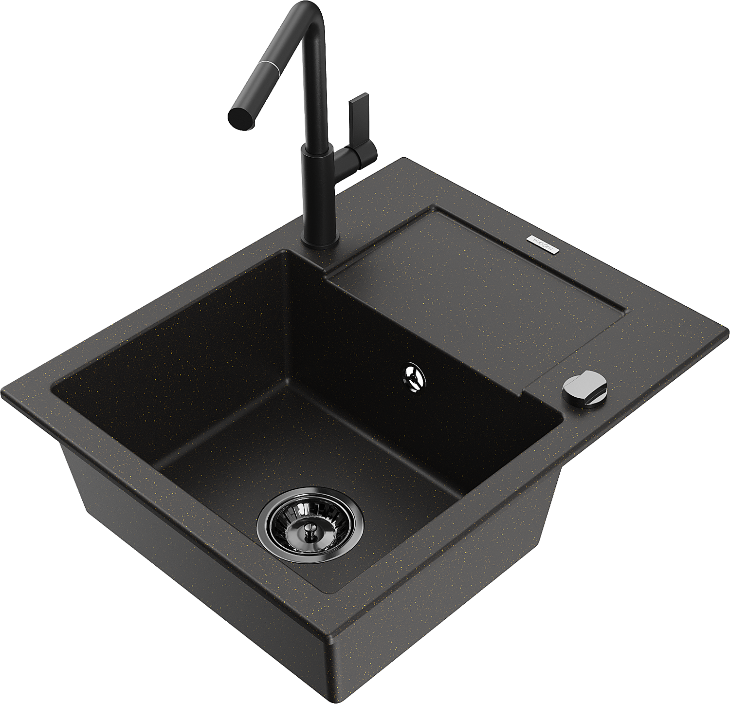 Mexen Enzo 1-bowl granite sink with drainer and Flora kitchen tap, black/golden metallic - 6506-75-670401-70-B