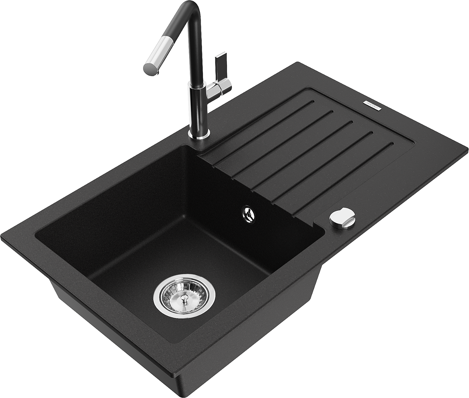Mexen Pablo granite kitchen sink with 1 bowl, drainer and Flora kitchen tap, black - 6510-77-670401-07