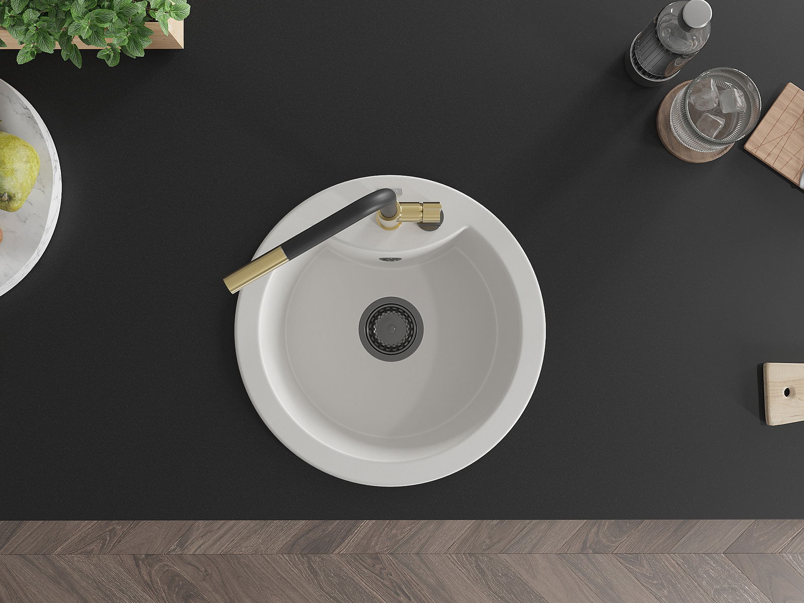 The surface of the sink is resistant to stains and discolouration, making it easy to maintain cleanliness and retain its colour for a long time of use. An aesthetic and practical addition to any kitchen.