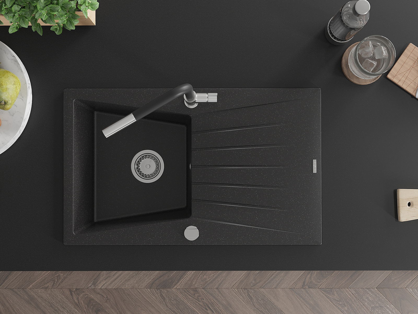 Mexen Cesar granite sink single-bowl with drainer and kitchen tap Flora, black/silver metallic - 6514-73-670401-07