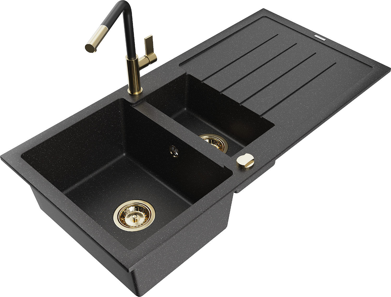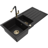 Mexen Andres Granite Sink 1.5-Bowl with Drainer and Flora Kitchen Tap, Black/Silver - 6515-73-670401-57-G