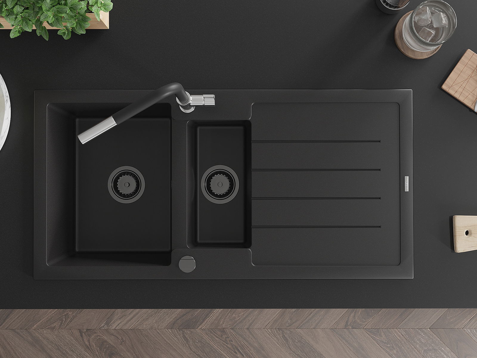 Choosing a sink with a draining board is a practical solution that allows you to set aside washed dishes or vegetables and fruits. The draining board makes daily cooking easier and helps maintain order in the kitchen.
