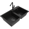 Mexen Tomas granite sink 2-bowl with Flora kitchen tap, black/silver metallic - 6516-73-670401-70-B