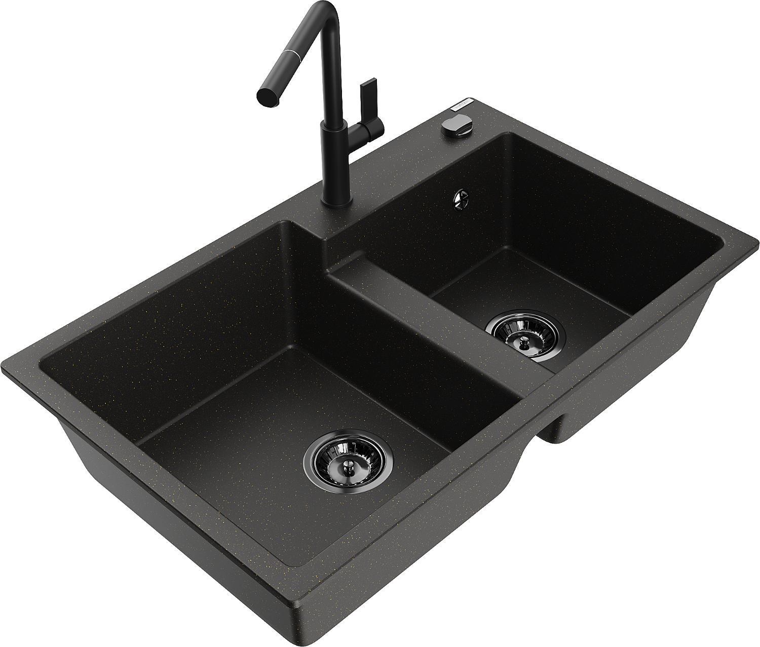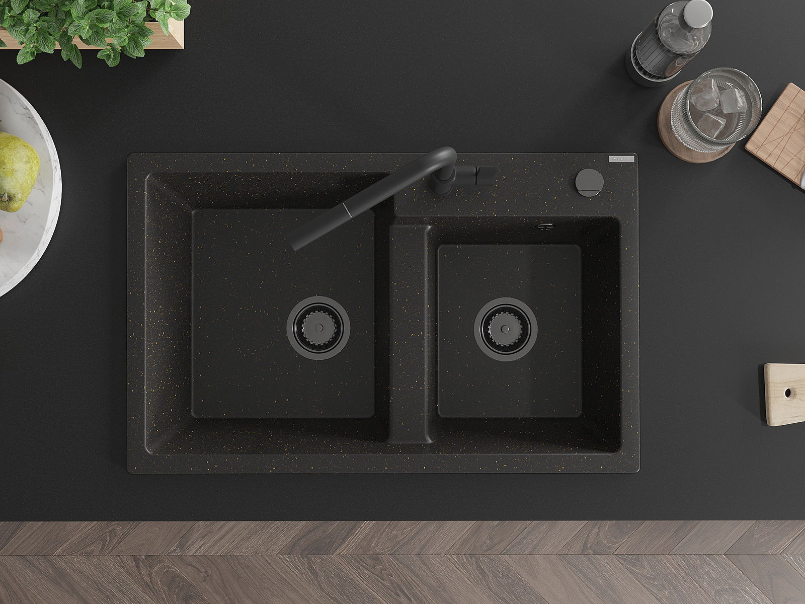 Mexen Tomas 2-bowl granite sink with Flora kitchen tap, black/gold metallic - 6516-75-670401-70-B