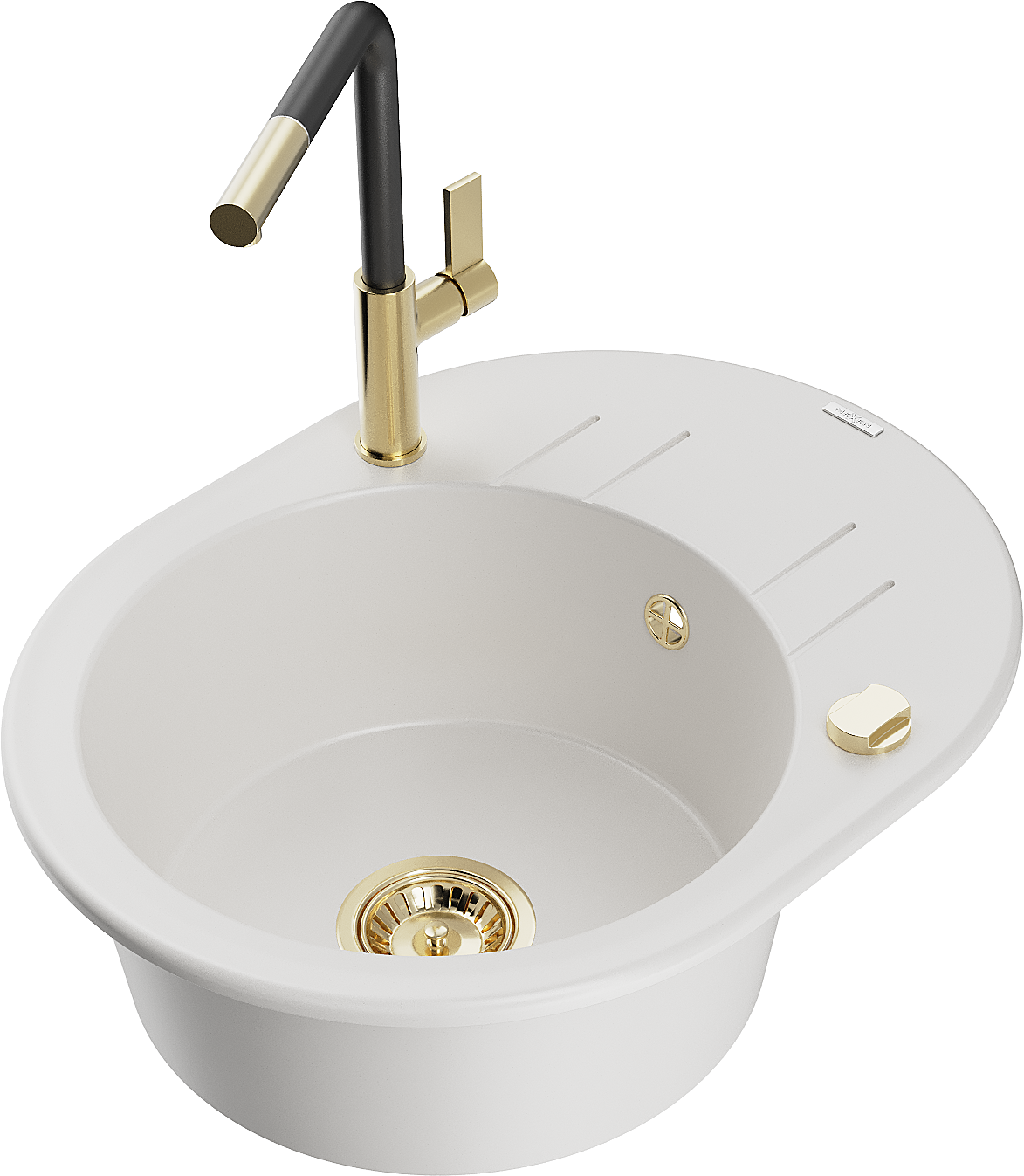 Mexen Kevin granite kitchen sink 1-bowl with drainer and Flora kitchen tap, white - 6517-20-670401-57-G