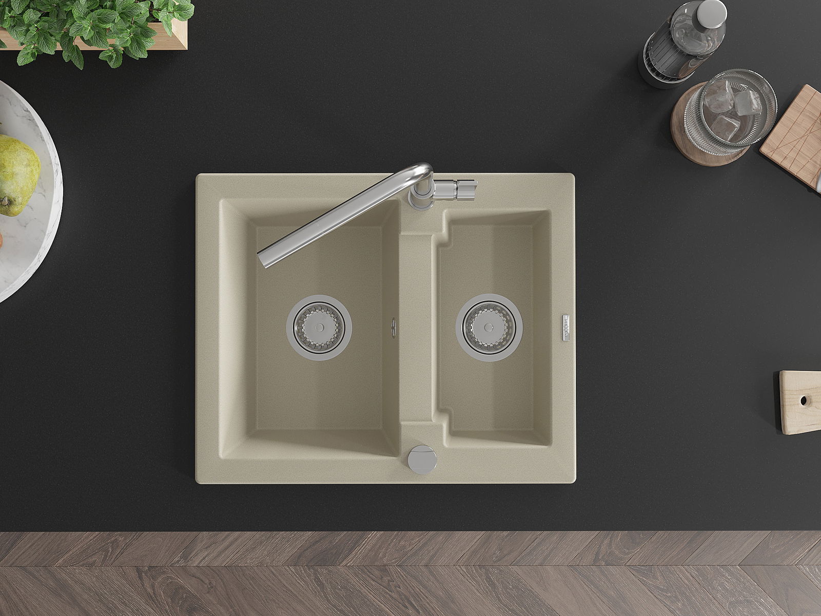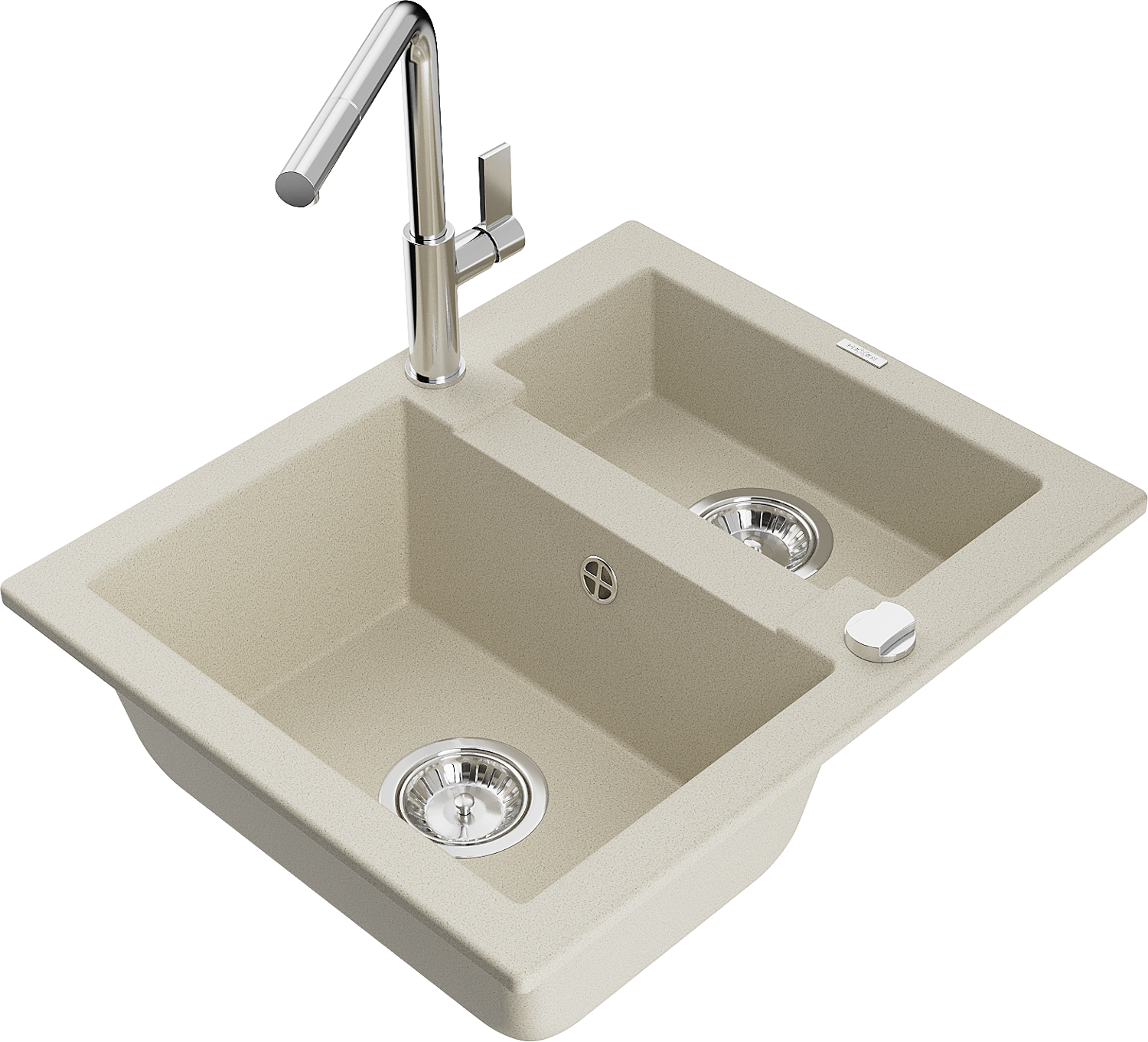 Mexen Carlos granite sink 1.5-bowl with Flora kitchen tap, beige - 6518-69-670401-00