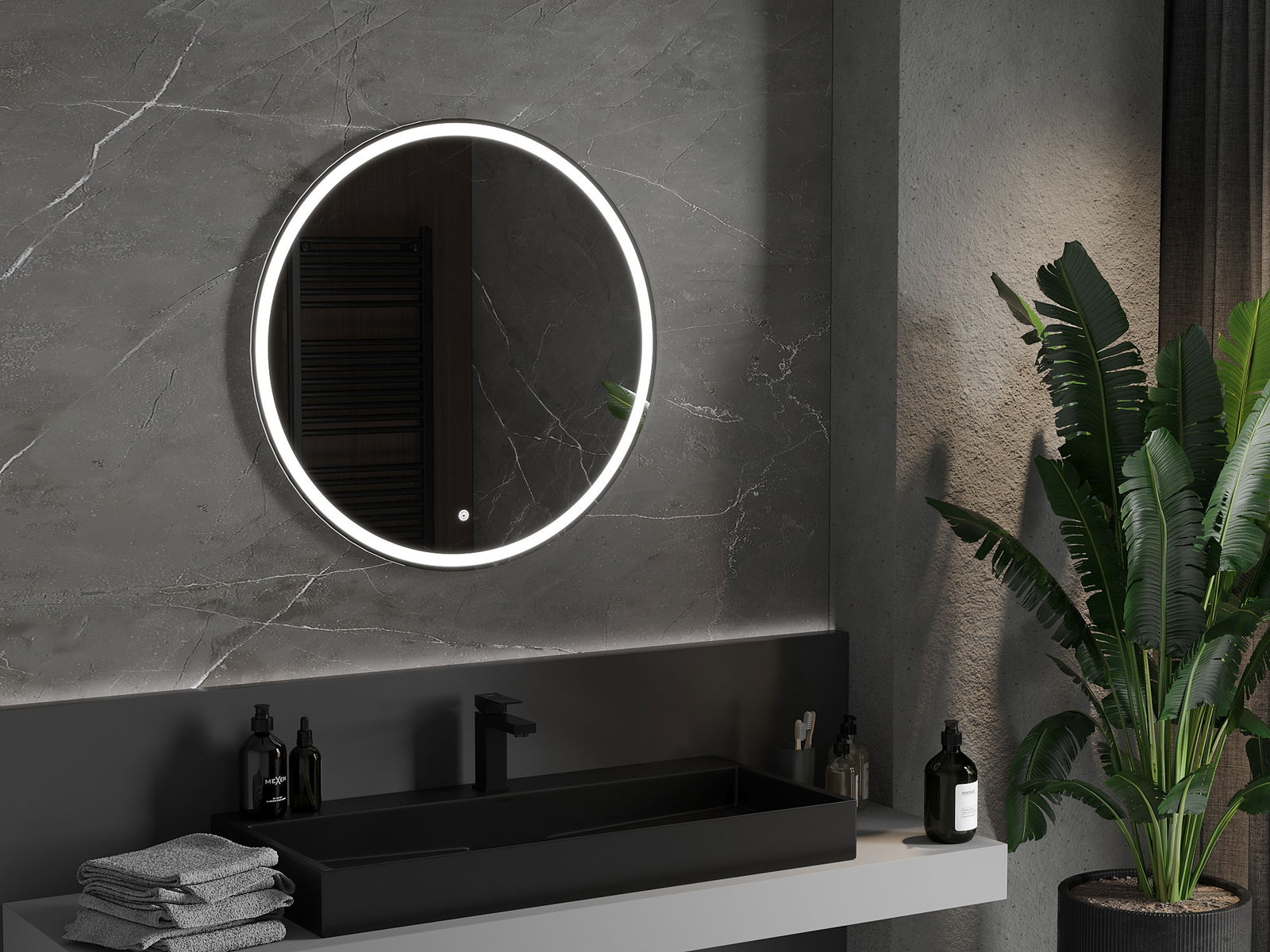 LED backlighting at the mirror is a practical element that makes daily grooming easier by providing the perfect illumination of the face. The backlighting gives the bathroom a modern finish, highlighting its elegant decor.
