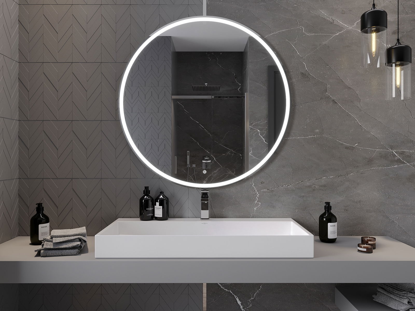 LED backlighting at the mirror is a practical element that makes daily grooming easier by providing the perfect illumination of the face. The backlighting gives the bathroom a modern finish, highlighting its elegant decor.