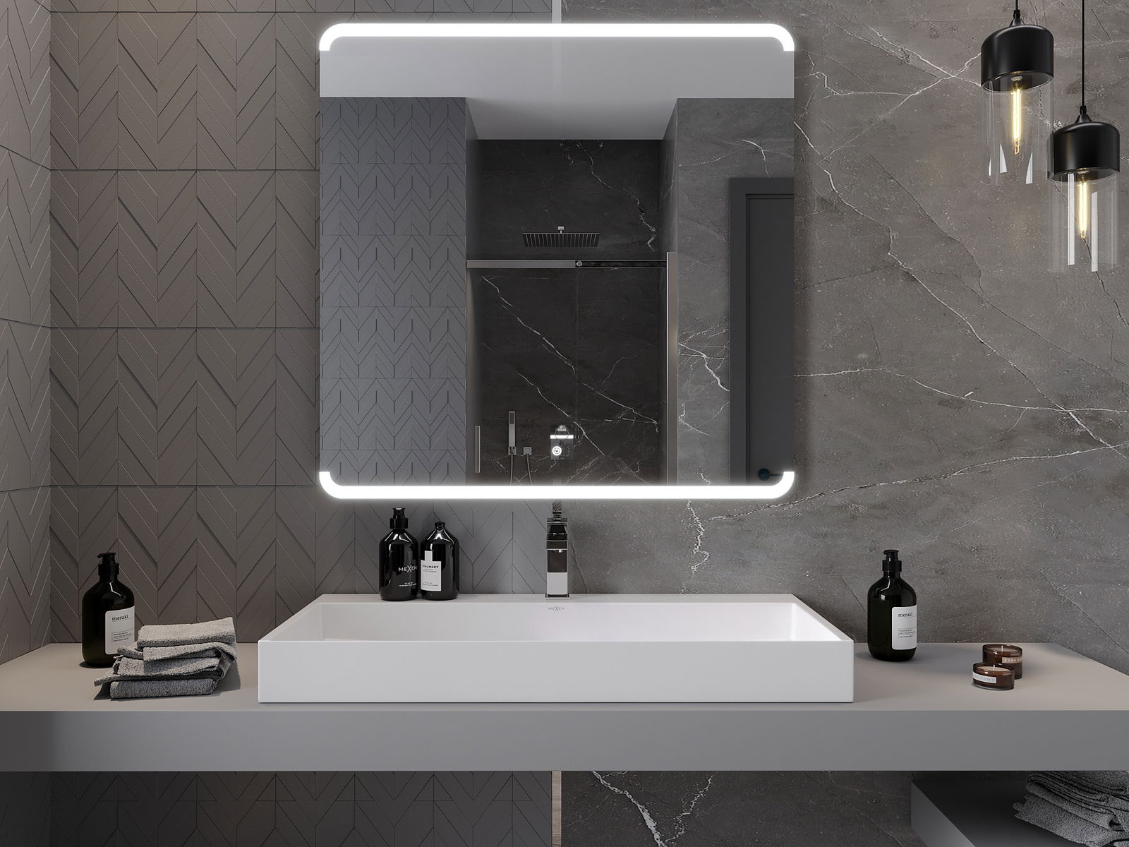 LED backlighting at the mirror is a practical element that makes daily grooming easier by providing the perfect illumination of the face. The backlighting gives the bathroom a modern finish, highlighting its elegant decor.