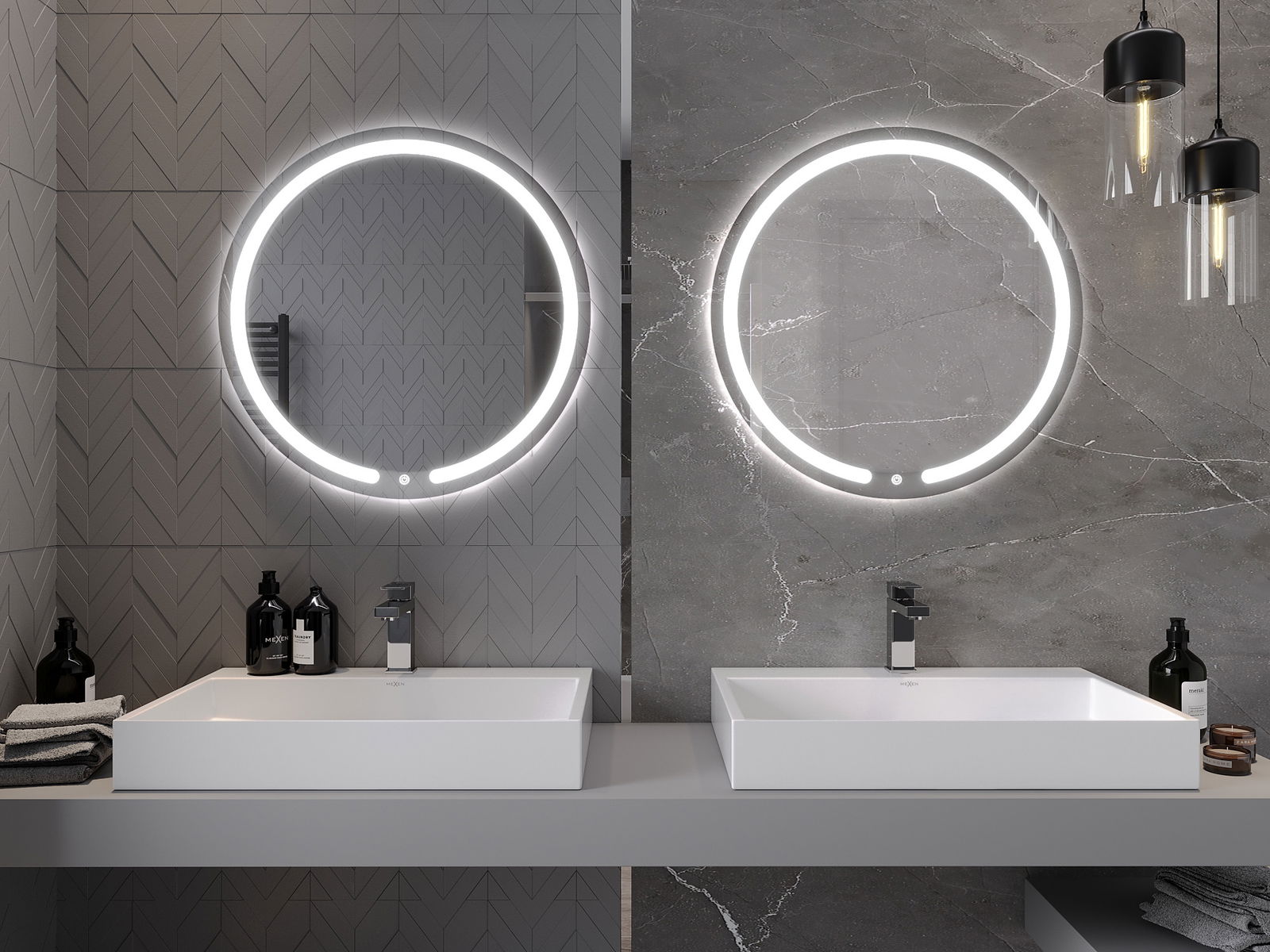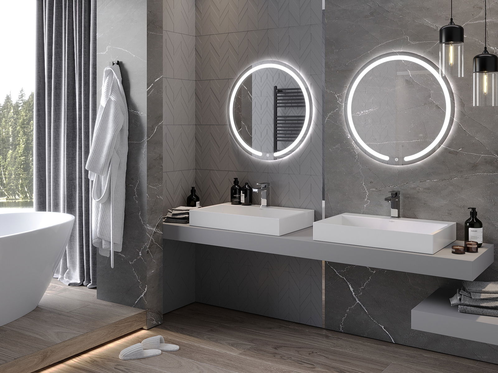 LED backlighting at the mirror is a practical element that makes daily grooming easier by providing the perfect illumination of the face. The backlighting gives the bathroom a modern finish, highlighting its elegant decor.