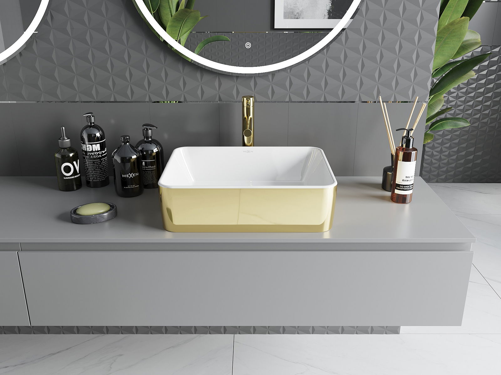 The countertop washbasin features an elegant white-gold finish, bringing a touch of luxury to any bathroom. Its dimensions of 48x37 cm and a depth of 10.5 cm make it ideal for smaller spaces. Made from high-quality sanitary ceramic, the washbasin offers not only an aesthetic appearance but also durability. Additionally, the absence of tap and overflow holes highlights its minimalist design, and the matt surface makes it easy to keep clean.