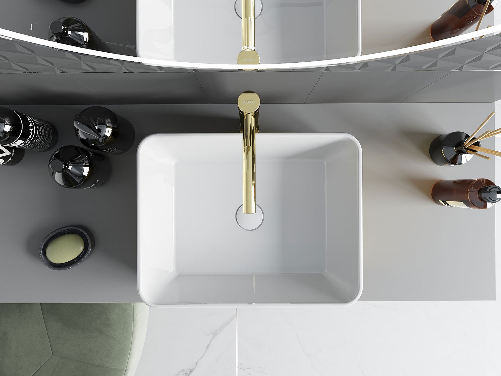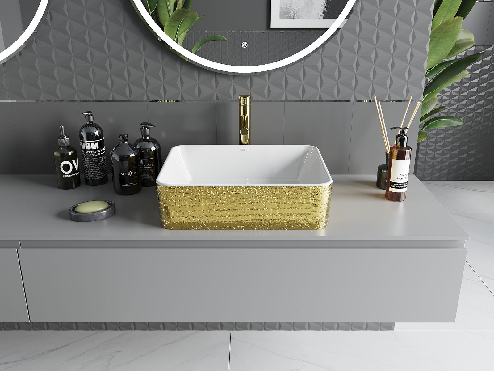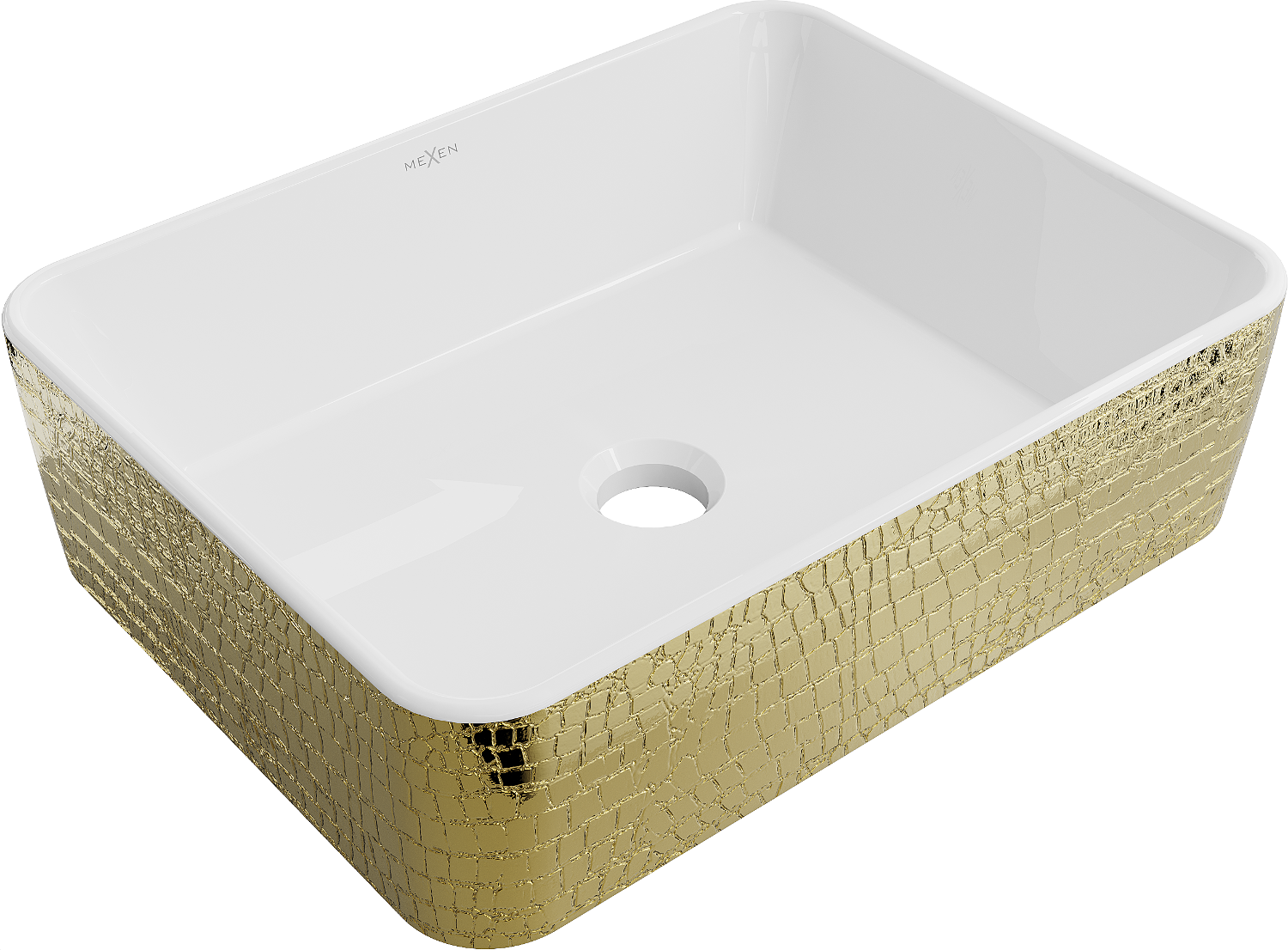 Mexen Catia is an elegant countertop washbasin measuring 48 x 38 cm, made of sanitary ceramic, combining aesthetics and functionality. Its white-gold scale pattern gives the bathroom a unique character, and the rectangular shape adds a modern touch. Thanks to its matte surface and protective coating, the washbasin is easy to maintain and resistant to scratches. Without tap and overflow holes, it has an elegant look, perfect for minimalist interior designs.