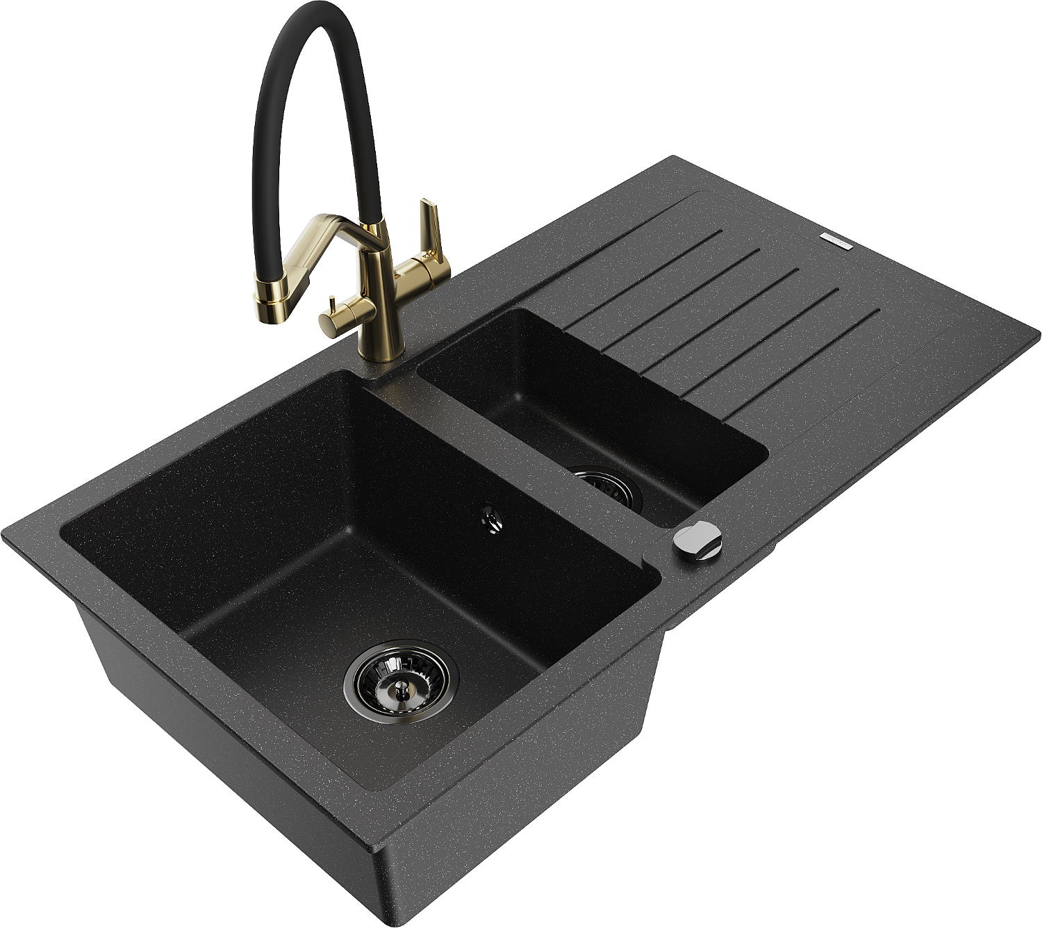 Mexen Matias granite sink 1.5-bowl with drainer and Duo kitchen tap, black/silver - 6502-73-671701-57-B