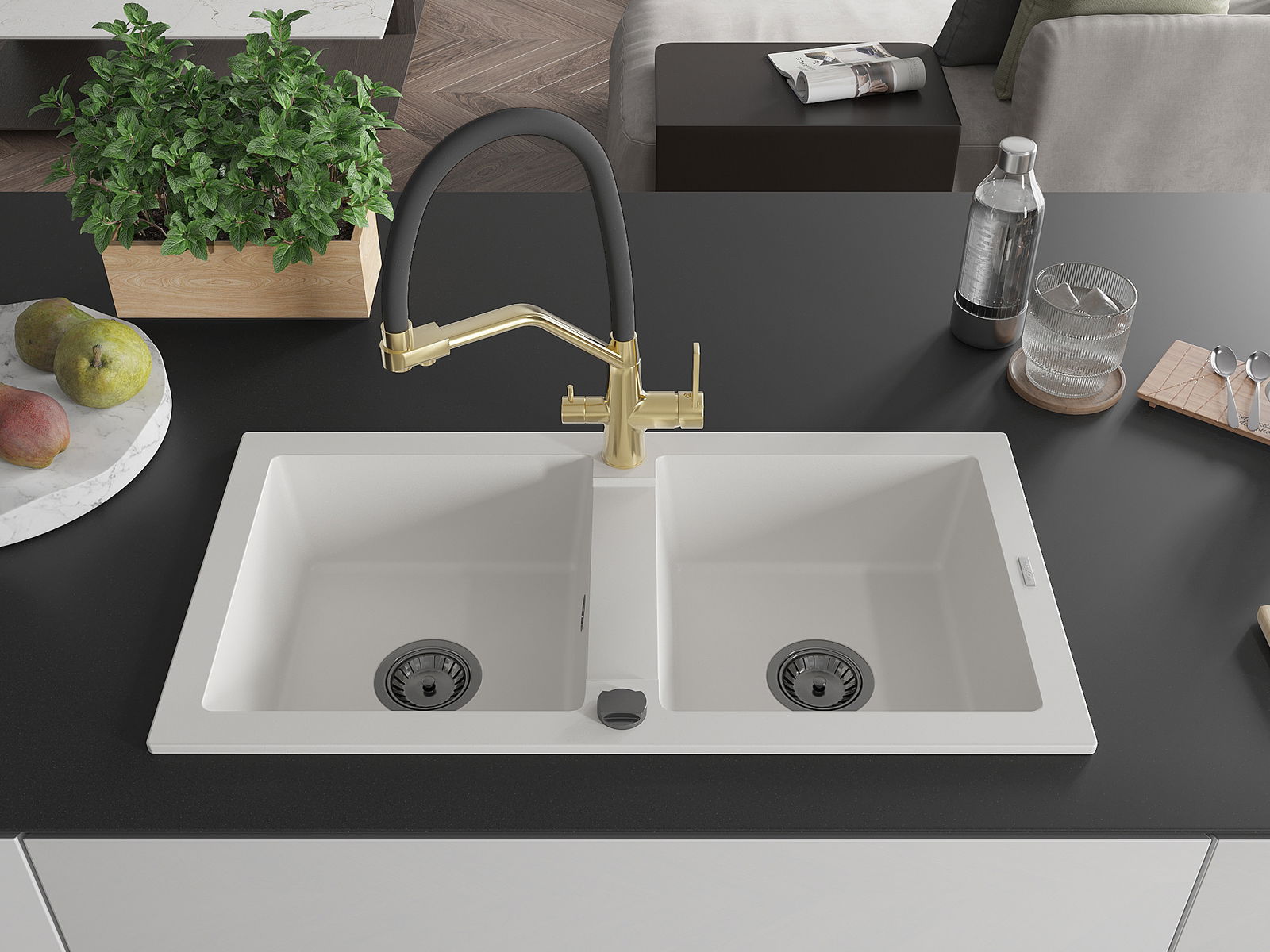The surface of the sink is resistant to stains and discolouration, making it easy to maintain cleanliness and retain its colour for a long time of use. An aesthetic and practical addition to any kitchen.