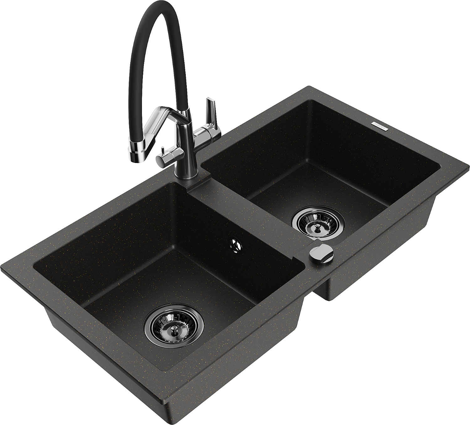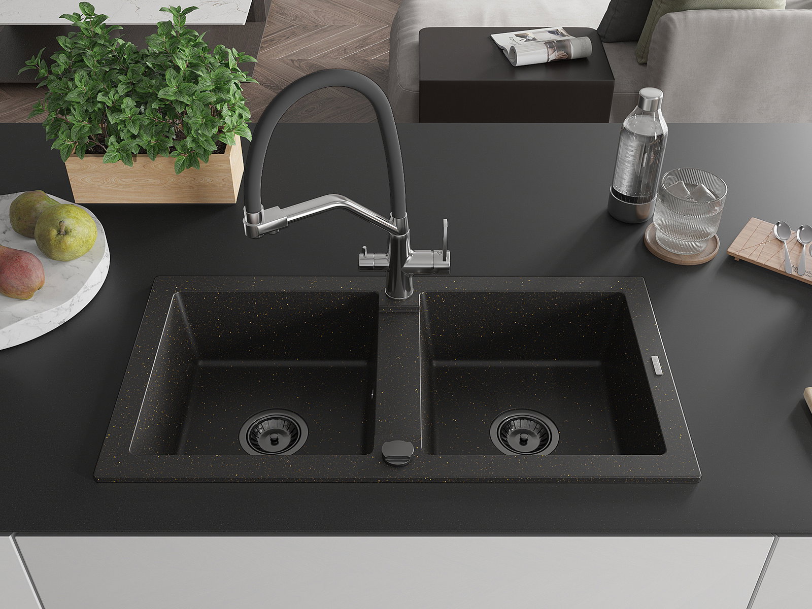 Mexen Mario granite kitchen sink 2-bowl with Duo kitchen tap, black/gold metallic - 6504-75-671701-07-B