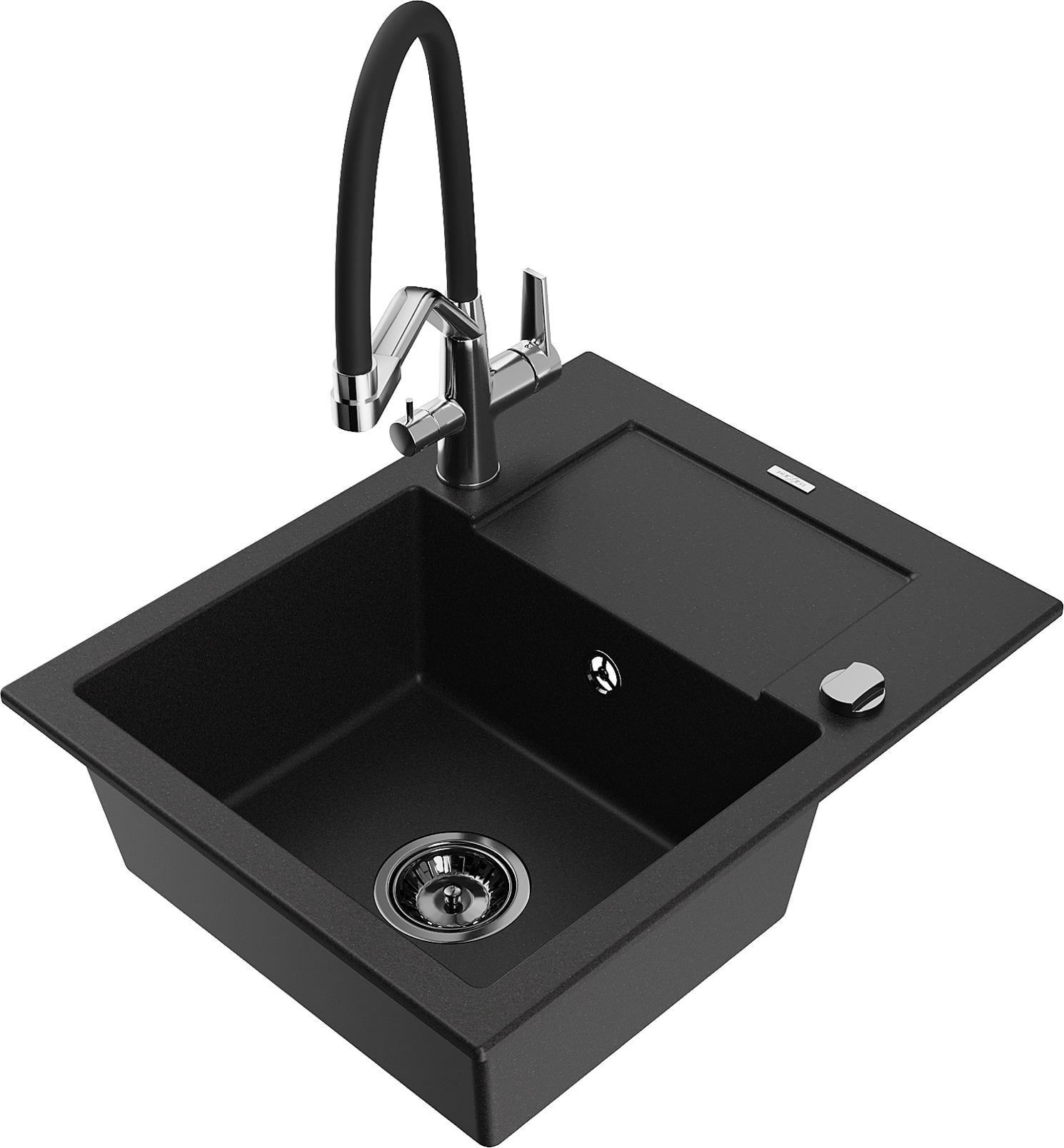 Mexen Enzo 1-bowl granite sink with drainer and Duo kitchen tap, black - 6506-77-671701-07-B