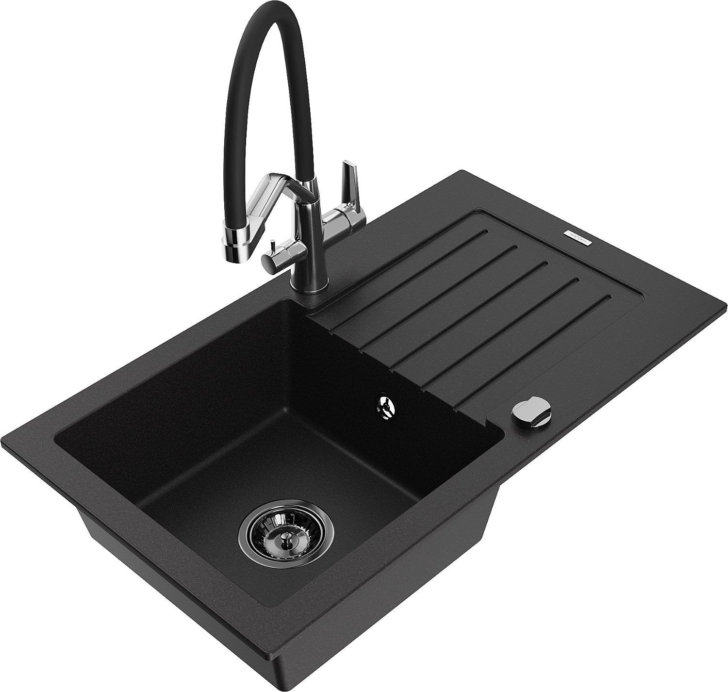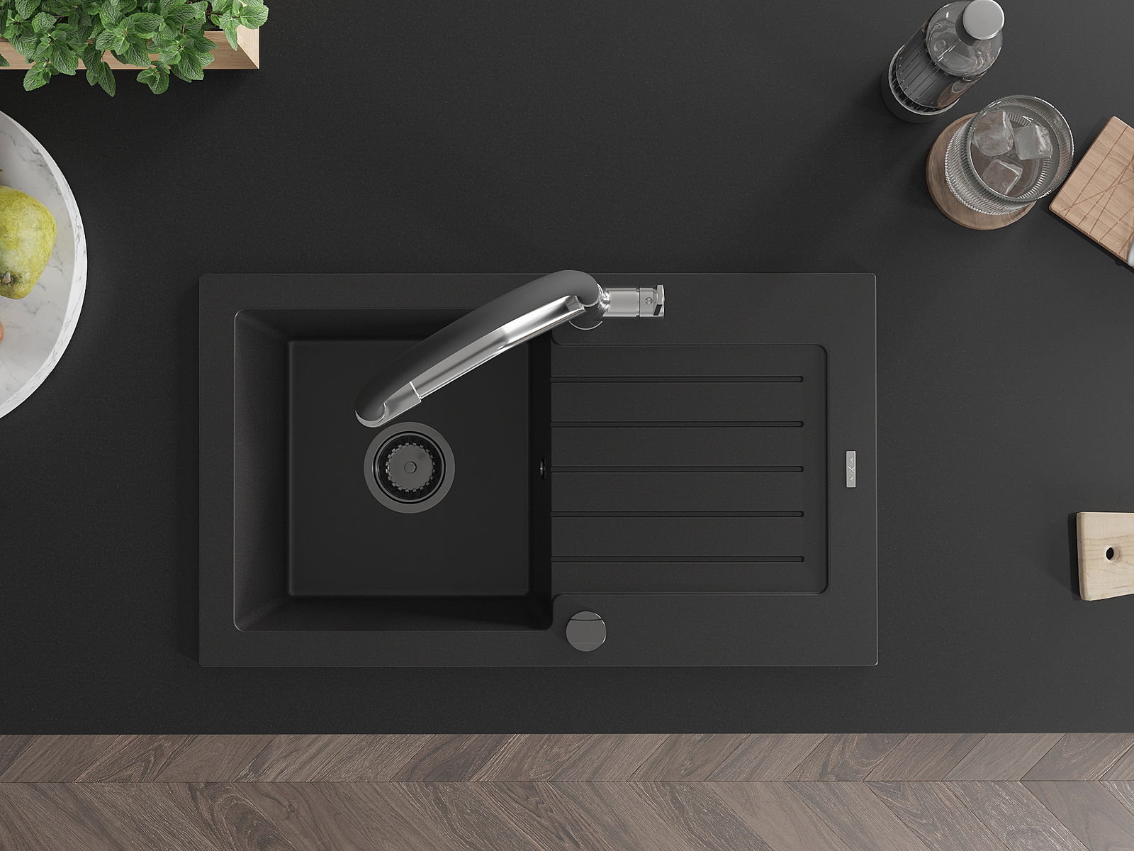 Mexen Pablo 1-bowl granite sink with drainer and Duo kitchen tap, black - 6510-77-671701-07-B