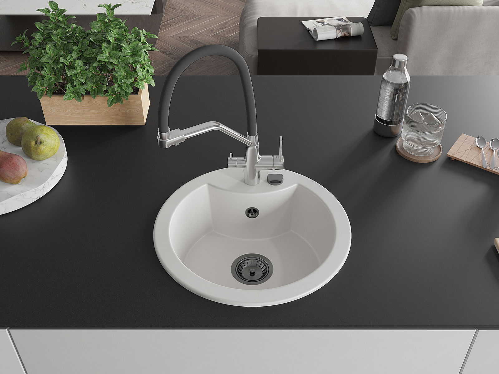 The surface of the sink is resistant to stains and discolouration, making it easy to maintain cleanliness and retain its colour for a long time of use. An aesthetic and practical addition to any kitchen.