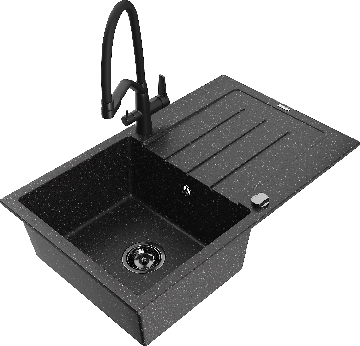 Mexen Bruno granite sink 1-bowl with drainer and Duo kitchen tap, black/silver metallic - 6513-73-671701-70-B