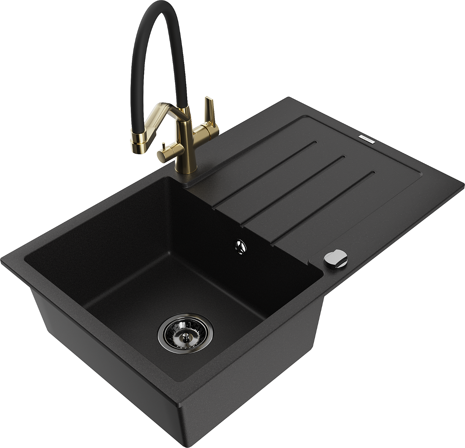 Mexen Bruno granite sink 1-bowl with drainer and Duo kitchen tap, black - 6513-77-671701-57-B