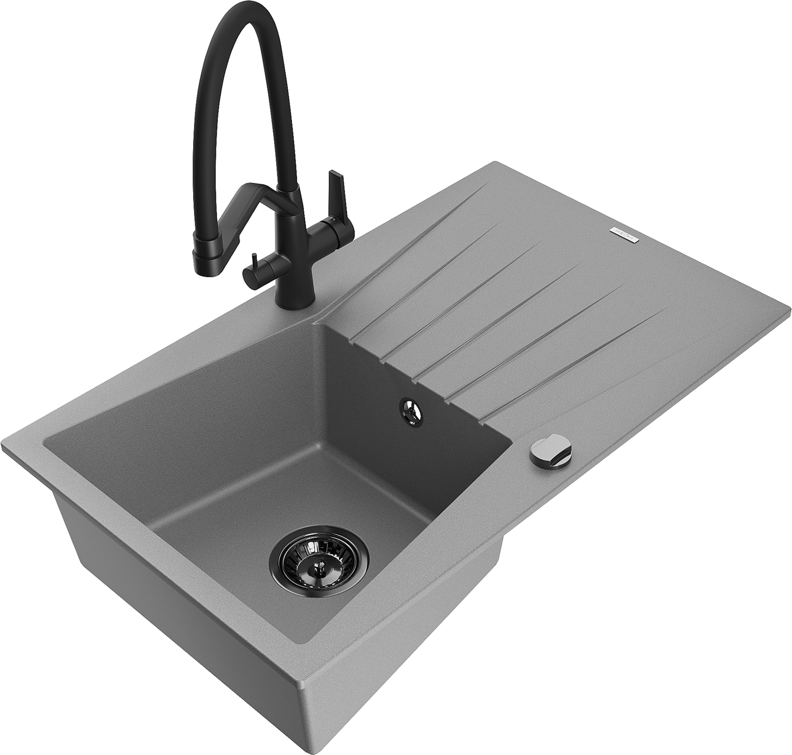 Mexen Cesar granite kitchen sink 1-bowl with drainer and Duo kitchen tap, grey - 6514-71-671701-70-B