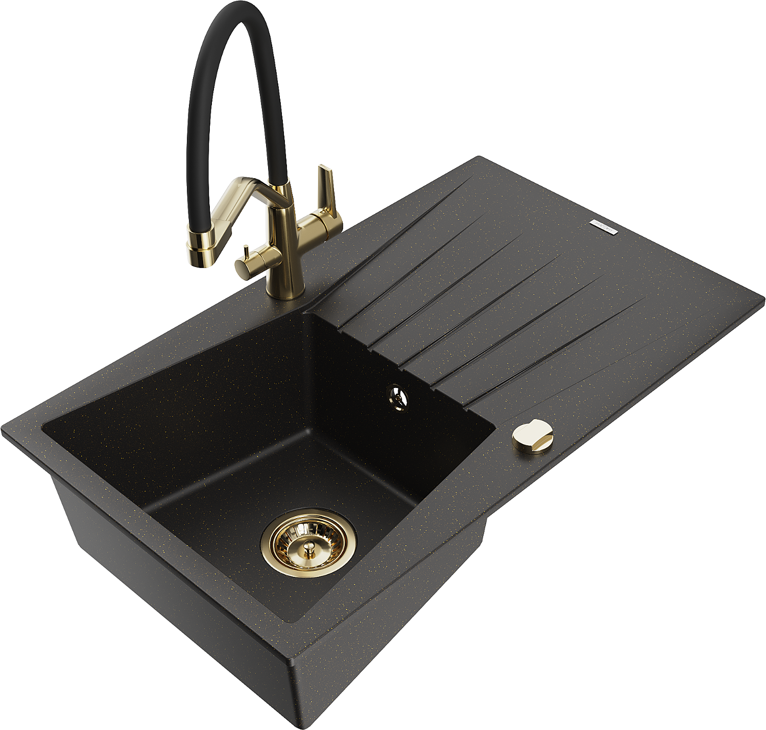 Mexen Cesar 1-bowl granite kitchen sink with drainer and Duo tap, black/gold metallic - 6514-75-671701-57-G