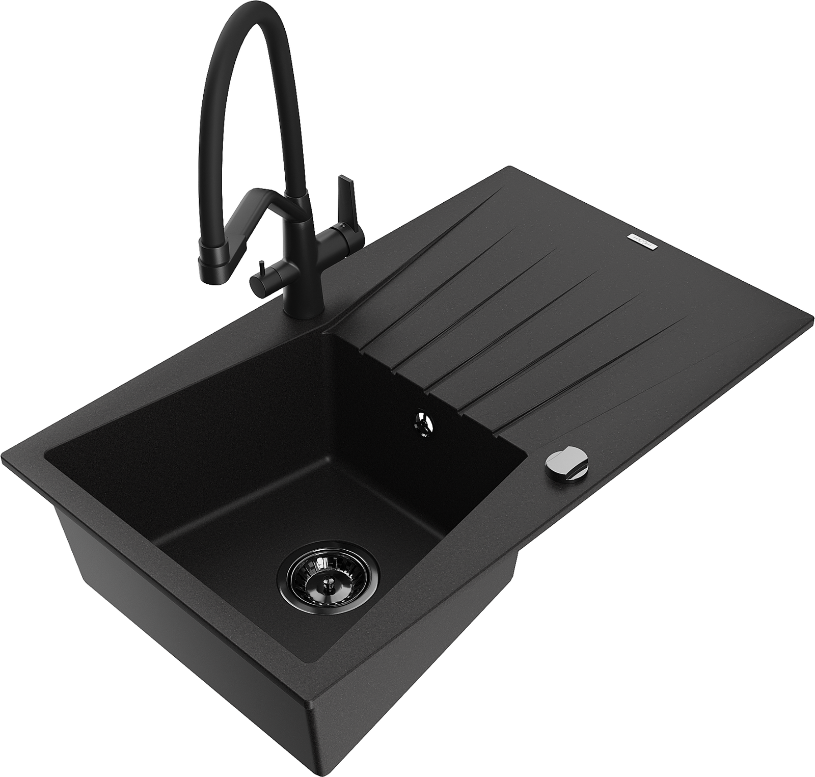 Mexen Cesar single-bowl granite sink with drainer and Duo kitchen tap, black - 6514-77-671701-70-B
