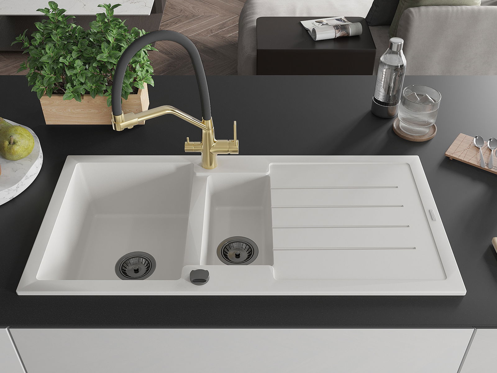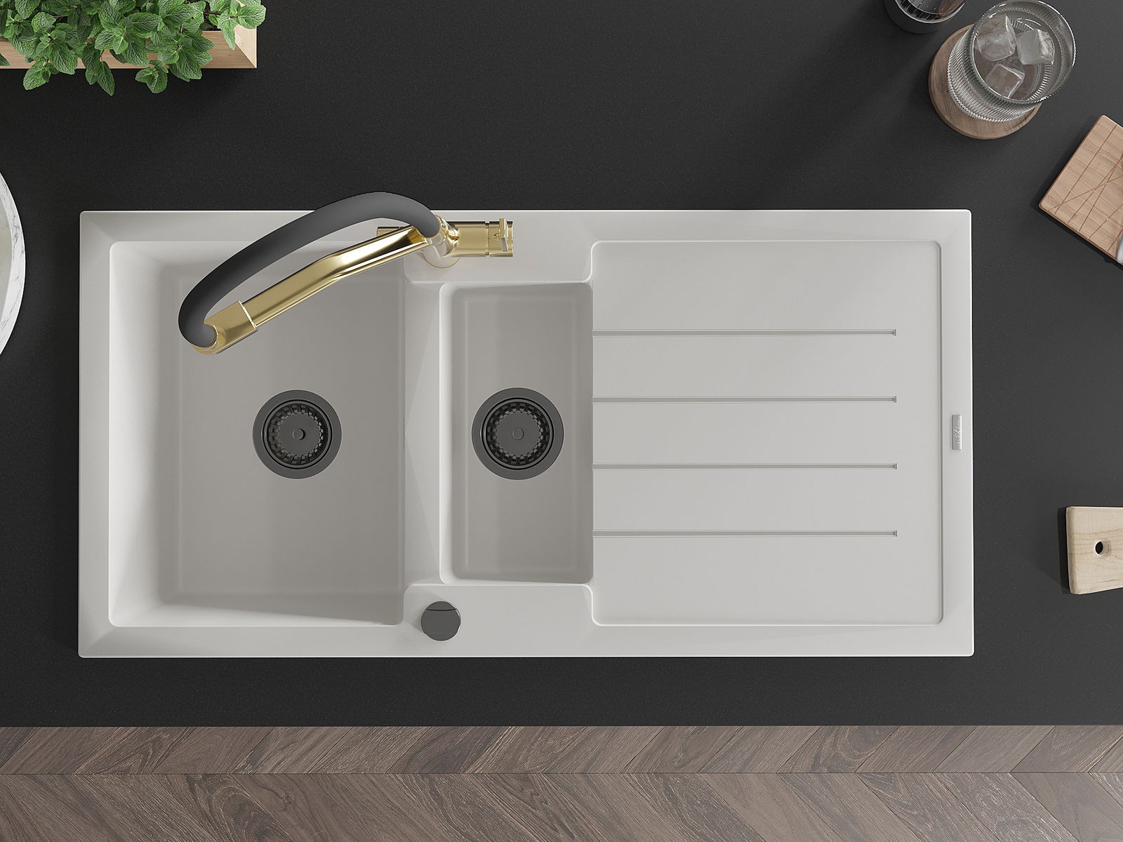 Choosing a sink with a draining board is a practical solution that allows you to set aside washed dishes or vegetables and fruits. The draining board makes daily cooking easier and helps maintain order in the kitchen.